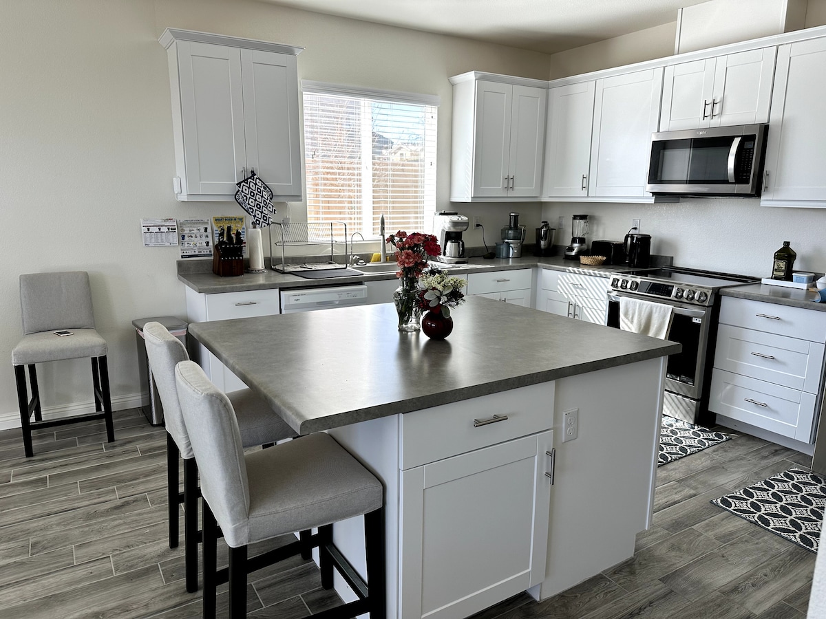 ¡Disfruta de un hogar lejos de casa! Esta casa está construida para una vida pacífica, con un plano de planta abierta. Sofá muy grande para sentarse en grupo, totalmente equipado con juegos de mesa, libros y novelas, una gran variedad de juguetes para niños, así como una gran cocina con electrodomésticos, utensilios de cocina, utensilios para hornear, etc. Las camas están equipadas con ropa de cama de lujo. Este terreno en esquina de una calle sin salida tiene vistas a Horseshoe Lake a lo lejos. Hay mucho aparcamiento en la acera, así como en la entrada y en el garaje. Asientos de comedor hasta 8, además de asientos de bar.