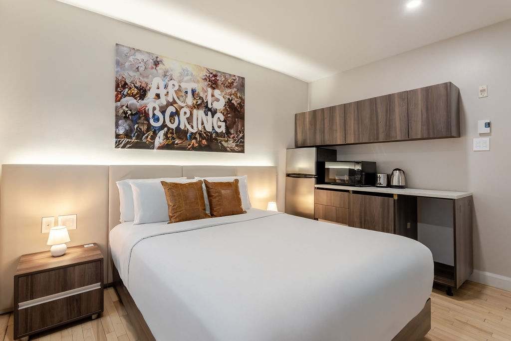 Esta elegante habitación de hotel combina estilo y comodidad, con una lujosa cama tamaño queen con sábanas de primera calidad. Situado en uno de los barrios más animados de Montreal, estás a pocos pasos de cafeterías, bares y joyas culturales. Los huéspedes también disfrutan de acceso a un acogedor salón en el vestíbulo y a un amplio sótano con cómodos asientos, una mesa de billar y un televisor de pantalla grande, perfecto para trabajar o relajarse.