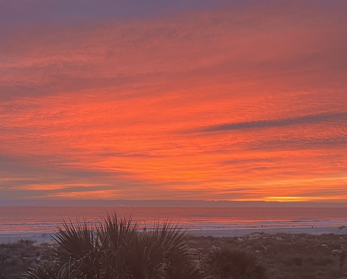 BEST spot to watch the sunrise, (and moonrise) on St Augustine Beach from every room in the condo and from the two direct beach front balconies! CORNER UNIT! TOP FLOOR! One balcony off the upstairs corner primary bedroom suite, walk in closet and ocean view King size beds in each bedroom. Anytime is a good time to be on the beach in St. Augustine! Winter Spring, Summer, or Fall! Besides being steps from the beach there are plenty of local eateries,great food, live music within walking distance.