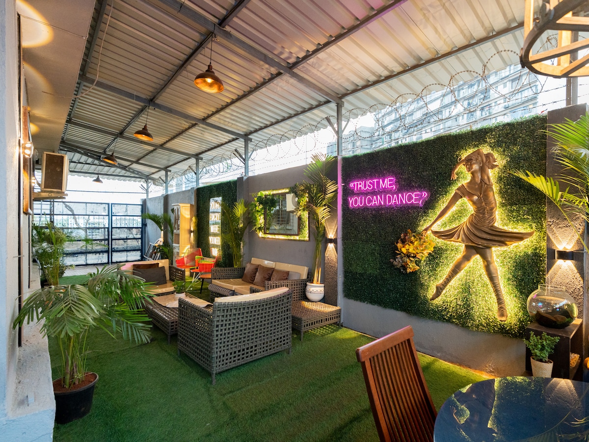 El apartamento con terraza se encuentra en un mercado urbano, a pocos pasos de la famosa playa de Juhu. El apartamento es abierto y espacioso, con una larga terraza llena de plantas. Es un oasis tranquilo en medio de una ciudad bulliciosa. La casa puede alojar cómodamente a dos personas en un dormitorio privado y a una persona adicional en el espacio del estudio (si la hamaca cuenta). Te despertarás con vistas a árboles verdes y cielos abiertos. La casa, aunque está en un edificio antiguo, cuenta con todas las comodidades modernas que uno necesita.