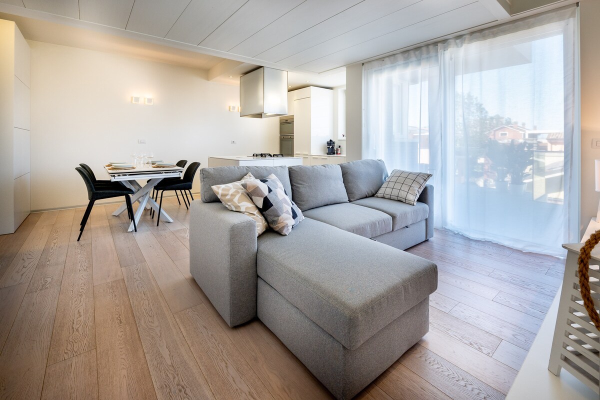 Encantador apartamento en la cuarta planta frente al mar, desde donde se puede admirar el amanecer y llegar a las playas de Fano simplemente cruzando la calle. Situado en la zona de Sassonia, a 5 minutos a pie del centro histórico y a 10 minutos a pie de la estación. El alojamiento consta de una gran sala de estar con cocina abierta, 2 dormitorios (1 con cama de matrimonio y 1 con sofá cama), un baño y un pequeño balcón muy panorámico. Rodeado de restaurantes, supermercados y servicios