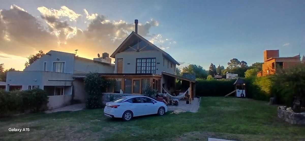 Vista franca a las altas cumbres y las sierras chicas, desde todas las ventanas y lugares de la casa. Es ideal para una familia grande o dos familias, espacios comunes amplísimos (living comedor y galería). La piscina es de uso exclusivo y esta cercada y el terreno es seguro. Gran Parrilla, Cochera techada para dos vehículos. Baulera para guardar tus cosas. Aires FC en todas las habitaciones, y dos en el living. Salamandra a Leña. Heladera con freezer, Wi fi, DTV.-