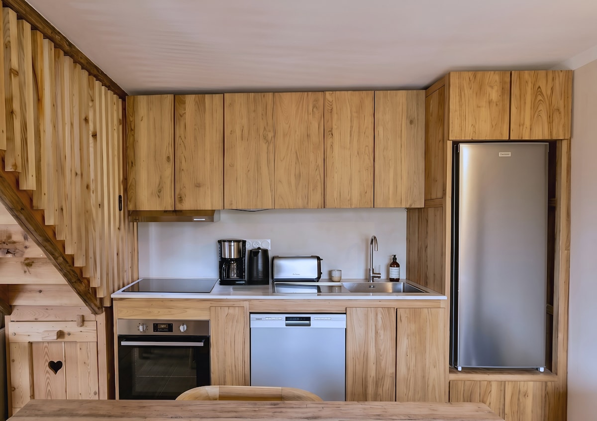 Espacio privado independiente para huéspedes con chimenea de leña en una casa de huéspedes boutique de montaña. El espacio ofrece privacidad y comodidad, con una cocina privada equipada. Se puede reservar por su cuenta o combinarse con habitaciones privadas adicionales cuando se viaja con más personas, con el precio ajustado en consecuencia. Los huéspedes tienen acceso a espacios compartidos al aire libre, como jardines, patio, zona de barbacoa y una bañera caliente al aire libre.