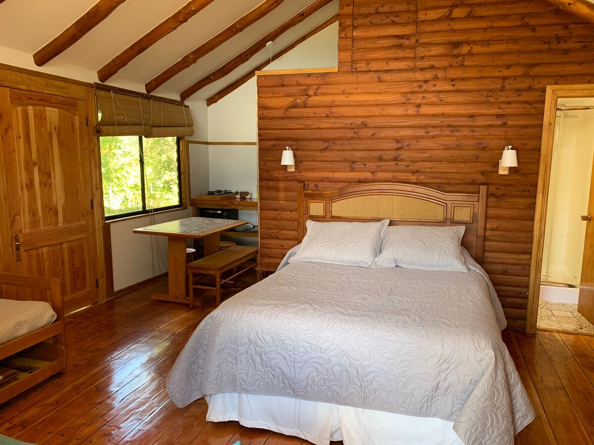 Cabaña de lujo tipo loft con finas terminaciones, inserta en un bosque centenario de arboles nativos. Baño en suite, walking closet, cocina integrada completamente equipada. Combustión a leña, estufa toyotomi. Gran terraza, parrilla, mesa en el bosque para asados, piscina, estacionamiento privado, smart tv, netflix, tv cable y wifi fibra optica.