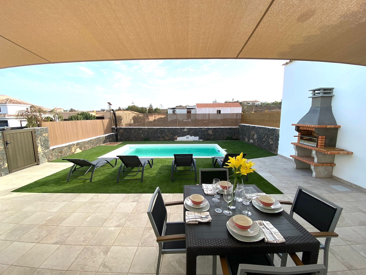 Villa con piscina privada, protegida del viento y soleada durante todo el día. Dos dormitorios, un baño, salón-cocina, comedor, cuarto lavadero independiente, wifi, amplia terraza con todas las comodidades y aparcamiento privado.