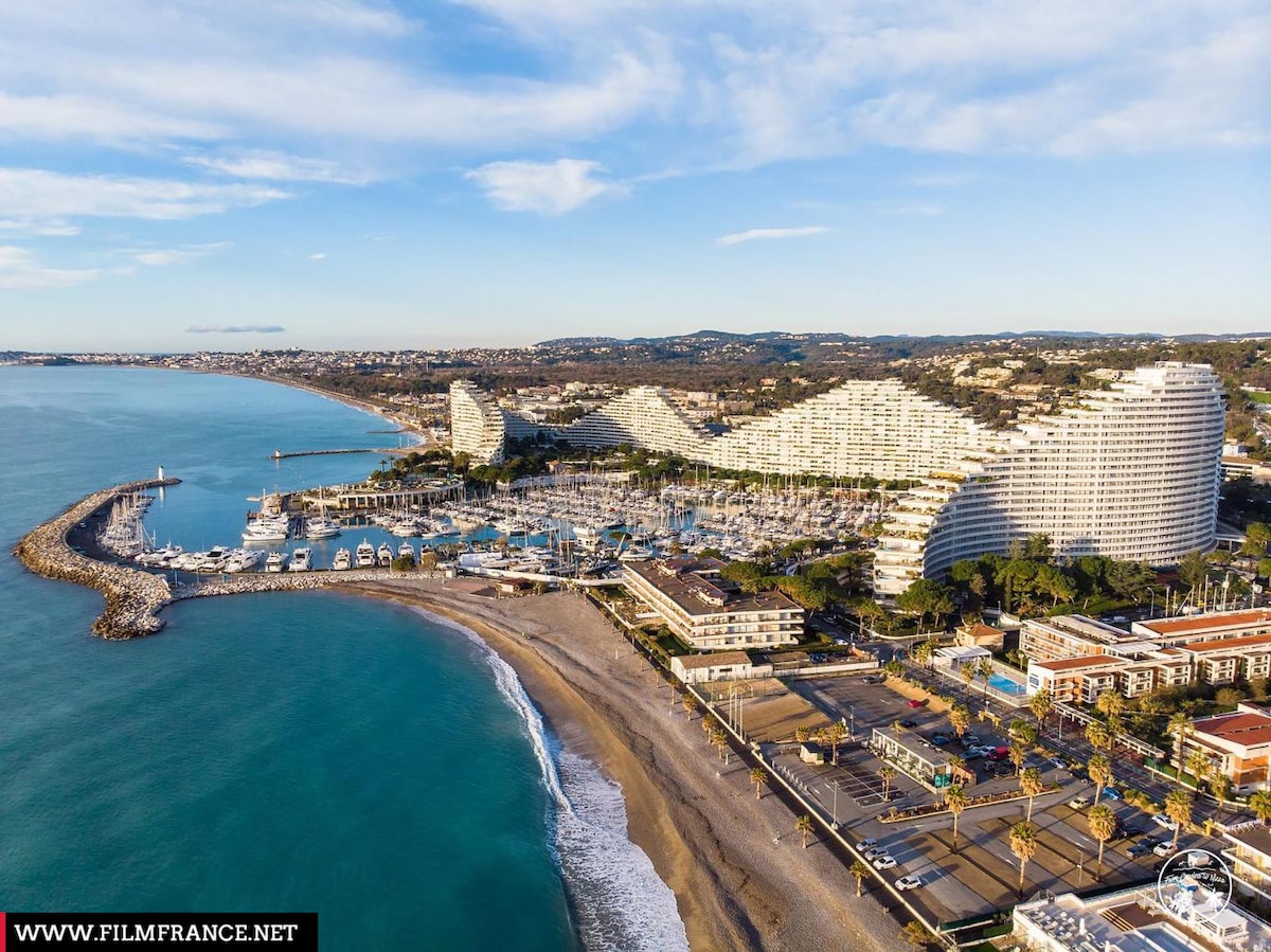 Bonito apartamento luminoso de 40 m2 para pareja o familia (2 adultos/2 niños). Amplia terraza soleada, vistas al mar y Marina (salón exterior, tumbonas). Aparcamiento seguro incluido. Salón con cocina equipada (lavavajillas, Nespresso, horno, placa de inducción). Habitación doble, una entrada a la cabina con 2 literas para dormir a los niños, ducha italiana, inodoro separado. Aire acondicionado, TV, Wifi, lavadora. A pocos pasos de la playa. Punto de partida ideal para visitar la Costa Azul.