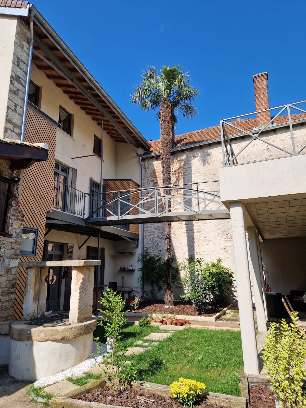 A los pies del Mont Brouilly, nuestra casa es un antiguo granero de 120 m². Fue completamente restaurada en 2017 para convertirse en un lugar moderno, luminoso y cálido, con grandes espacios y vigas a la vista. Adosada a nuestra casa familiar, se encuentra en una aldea tranquila, a 5 minutos de la estación de tren.