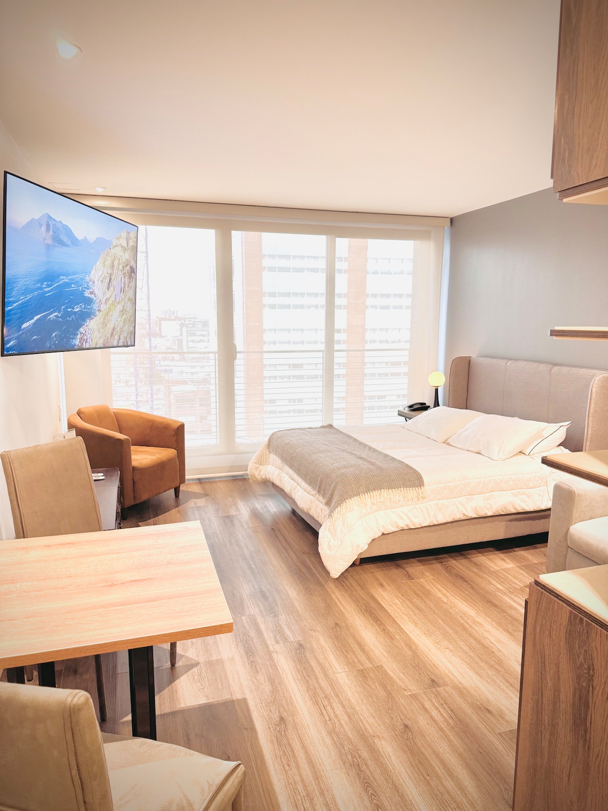 Ubicación estratégica, frente a importantes avenidas, moderno y muy cómodo, con llegada autónoma (cerradura digital). Ideal para viajes de negocios, parejas y amigos, cortas o largas estadías; cerca al Parque el Virrey, Zona Rosa. Espacios cómodos y bien dotados, cama doble hotelera, cocina equipada, comedor, sala y terraza, ducha caliente, TV 42', 2 hornos, nevera. El edificio cuenta con zona de lavandería, co-working y vigilancia 24 hrs. NOTA: Revisar políticas de visitantes y parqueadero.