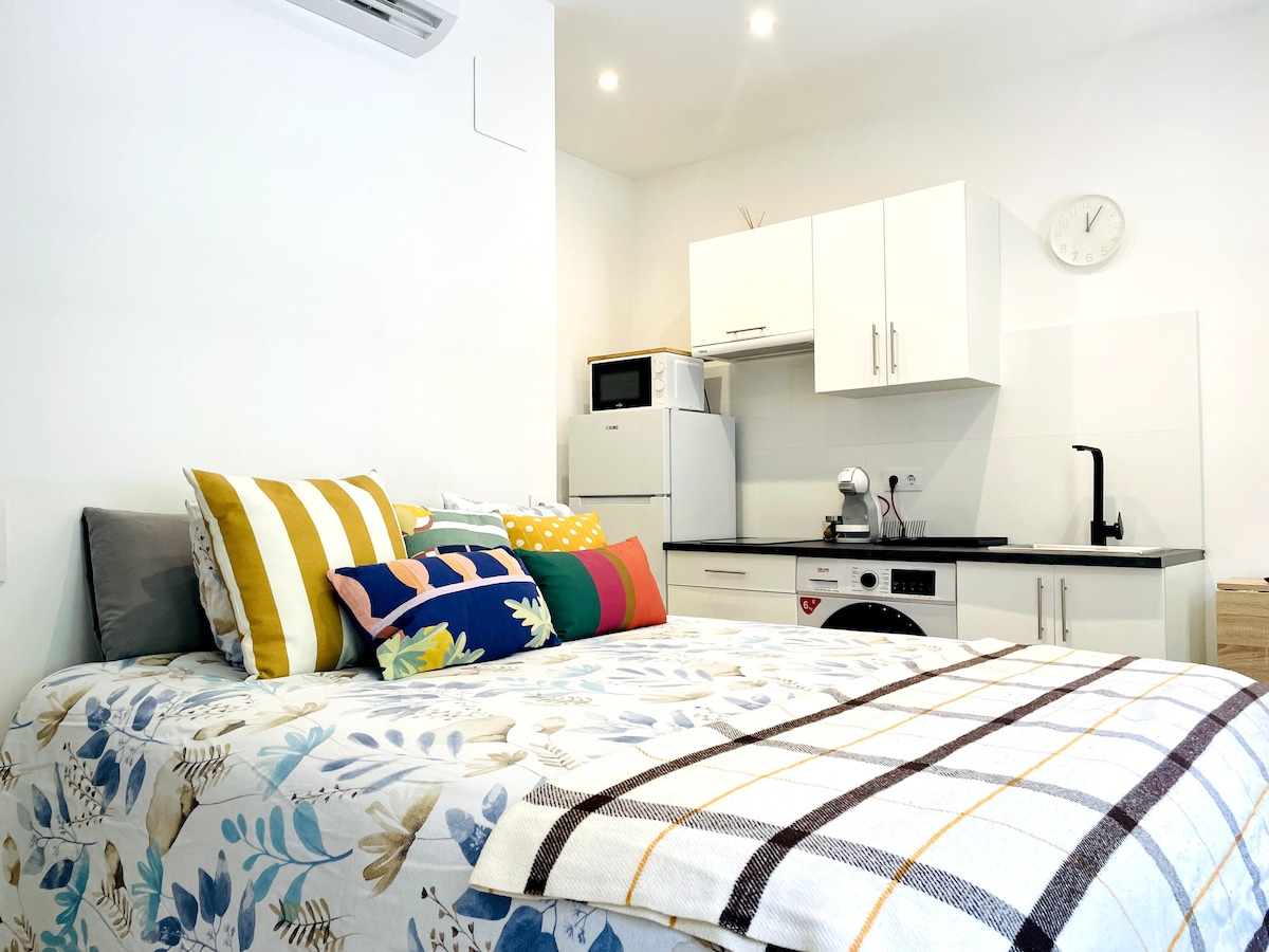 Modern 1-Bedroom with Terrace in Vista Alegre /Carabanchel’s Arts District This stylish one-bedroom apartment offers modern comfort featuring a custom kitchenette, spacious bathroom, and a cozy living area with a sofa bed. It's ideal for a couple or 3 friends traveling. Enjoy a private terrace and easy access to two metro lines, a pedestrian shopping street, and direct bus to top landmarks like the Royal Palace and Plaza Mayor. It's a perfect blend of convenience, budget and style.