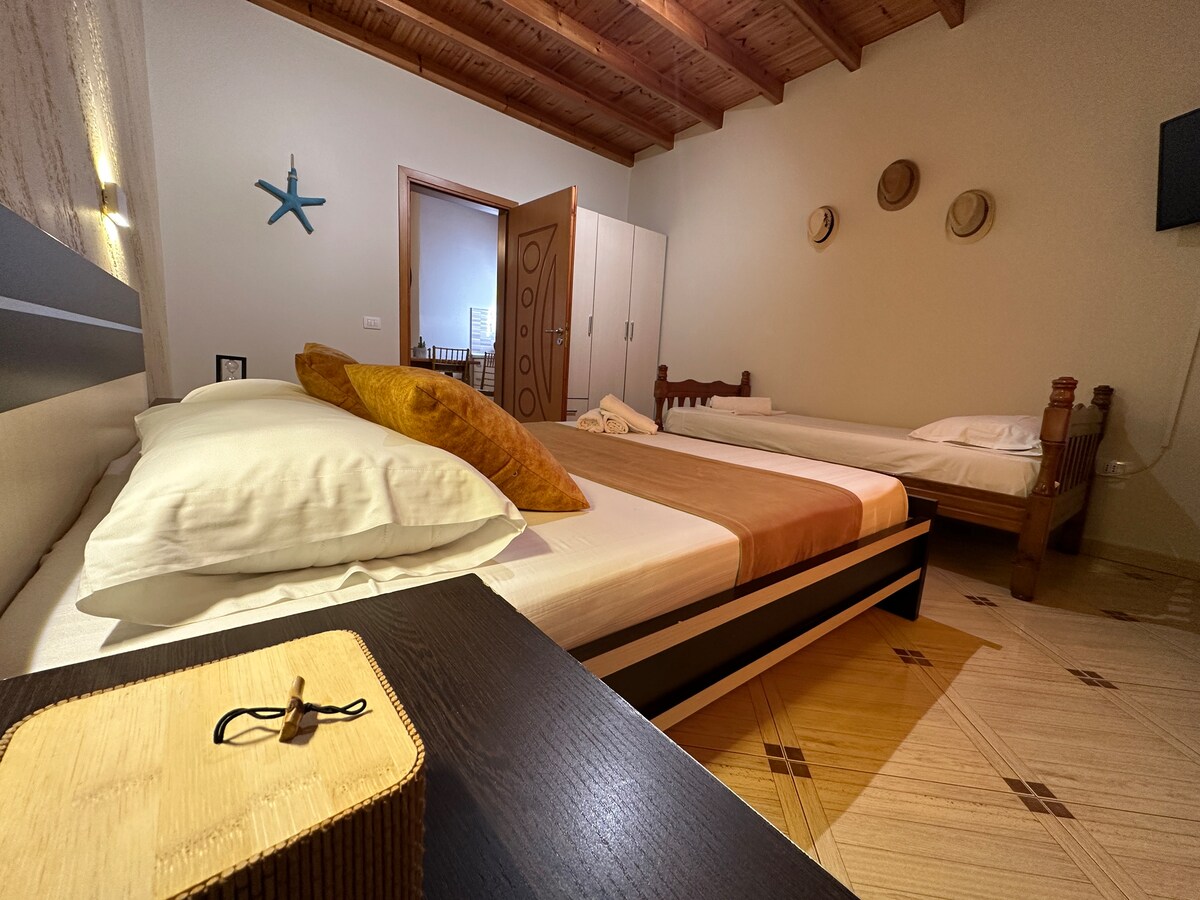 Relajate con toda la familia en este tranquilo lugar para quedarse, a solo 3 minutos a pie de Lungomare. Es el lugar perfecto para disfrutar de Vlora, pero también para descansar tranquilamente después de un largo día de playa. El departamento es nuevo y está totalmente equipado con todos los servicios básicos. En la sala de estar hay un televisor inteligente donde puedes disfrutar de tus programas y música favoritos. La cama principal es de tamaño estándar y las 2 camas individuales son (120 cm x 200 cm). Queremos que te sientas en casa y disfrutes de nuestra hermosa ciudad.