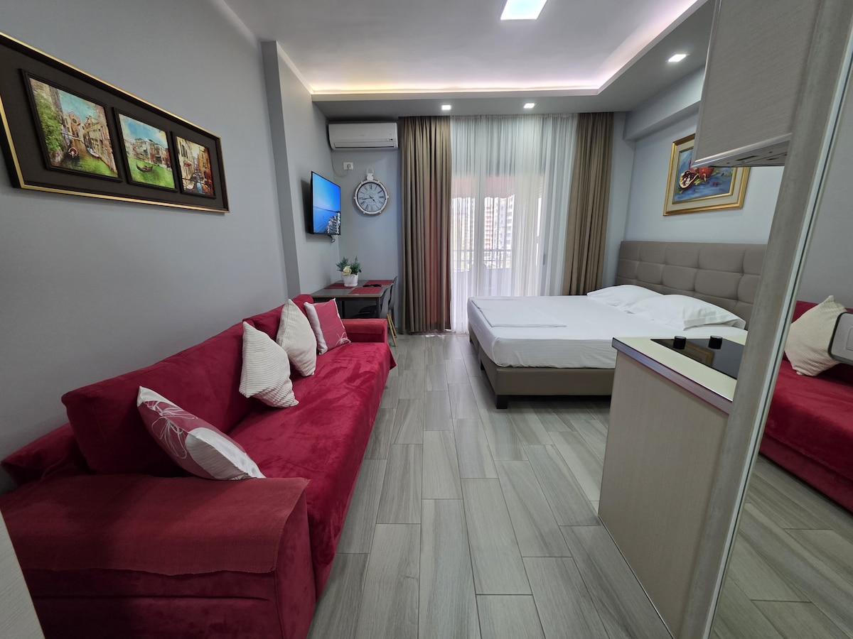 Welcome to the Lord Byron Boutique Studio, your serene escape in the heart of Vlorë. Located steps from the Petro Marko Theater and overlooking a peaceful city park, this elegant studio is perfect for couples, a group/family of three, solo travelers, or digital nomads seeking charm, comfort, and convenience. Designed with care, the space combines classic charm with modern comfort—featuring a queen-size bed, a cozy sitting area, and a fully equipped kitchen, ideally located to enjoy Vlore.