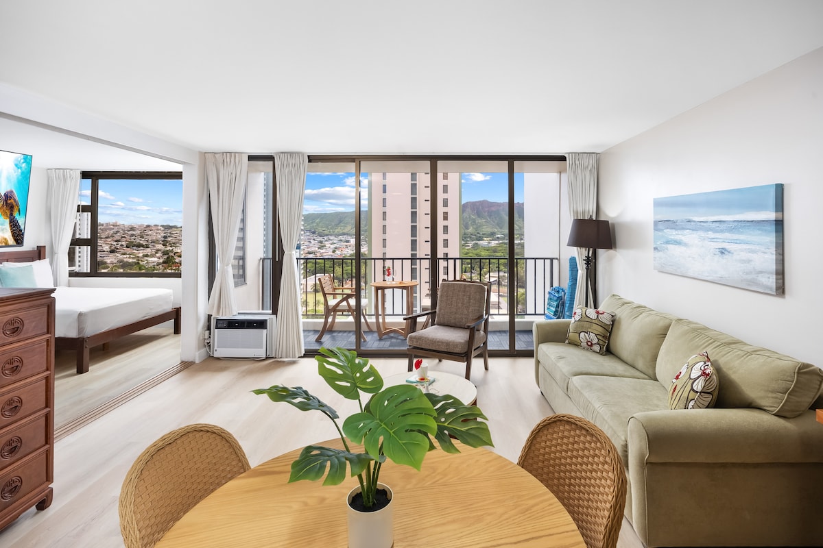 🚪True bedroom fully separate from the living room 🌊 Ocean + City Views from the living room ⛰️ Mountain + Canal Views from the bedroom ❄️ Central AC & quiet bedroom 🏊 swimming pool opens daily 🛍️ 2 min walk to Waikiki Beach, shops, dining & nightlife 🧊 Full-size fridge and fully stocked kitchen 🍹Private balcony with outdoor dining set Our listing works like hotel. This listing includes multiple units 's. All units are in the same building .This quote is for Cottage Waikiki.