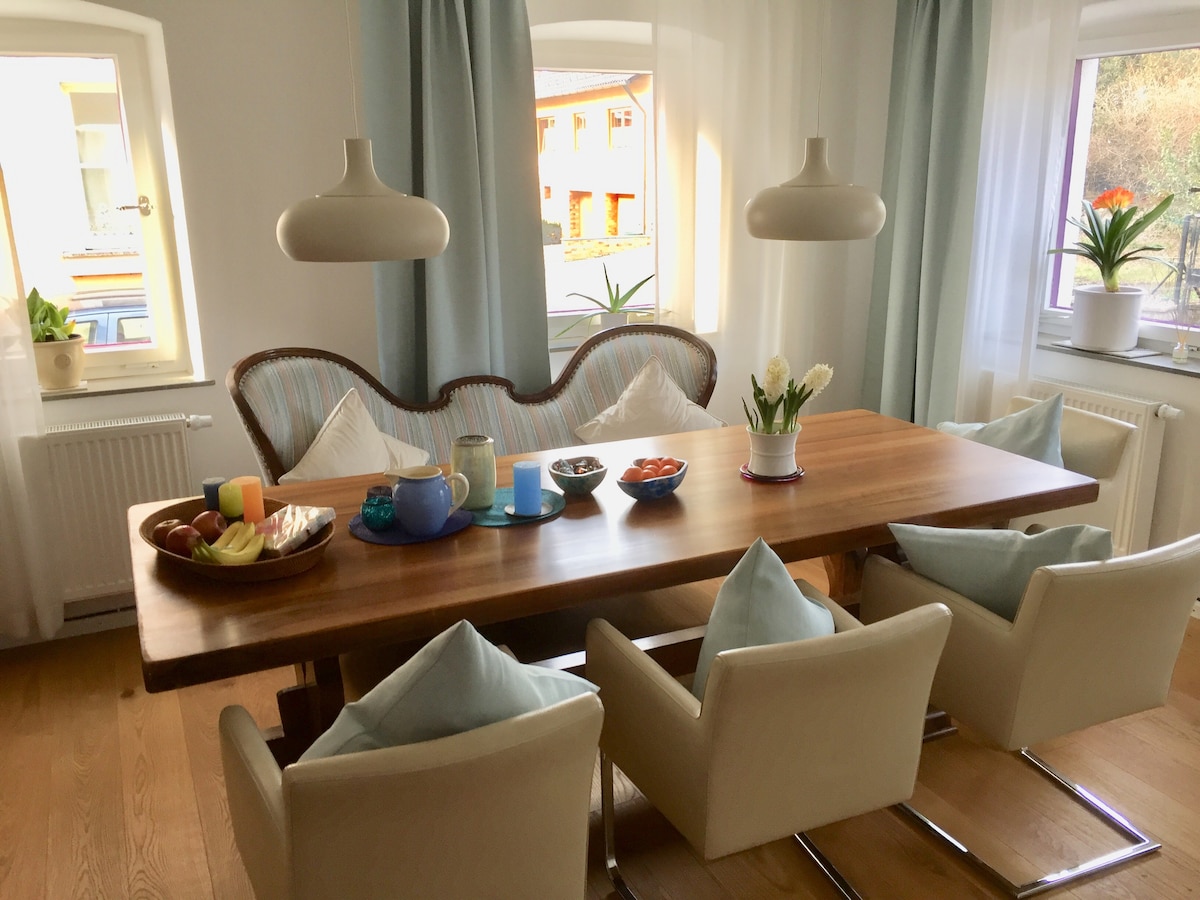 Within a 6000 sqm plot below the Veste Coburg you get a bungalow with every comfort. 3 rooms, 100 sqm, with kitchen (equipped with everything), two bathrooms, secluded terrace with large garden. Absolutely quiet and yet right in the middle of it all. 5 minutes by car and 10 minutes on foot to the center. High-quality furnishings. Floor-to-ceiling windows with a wonderful view of nature and Coburg.