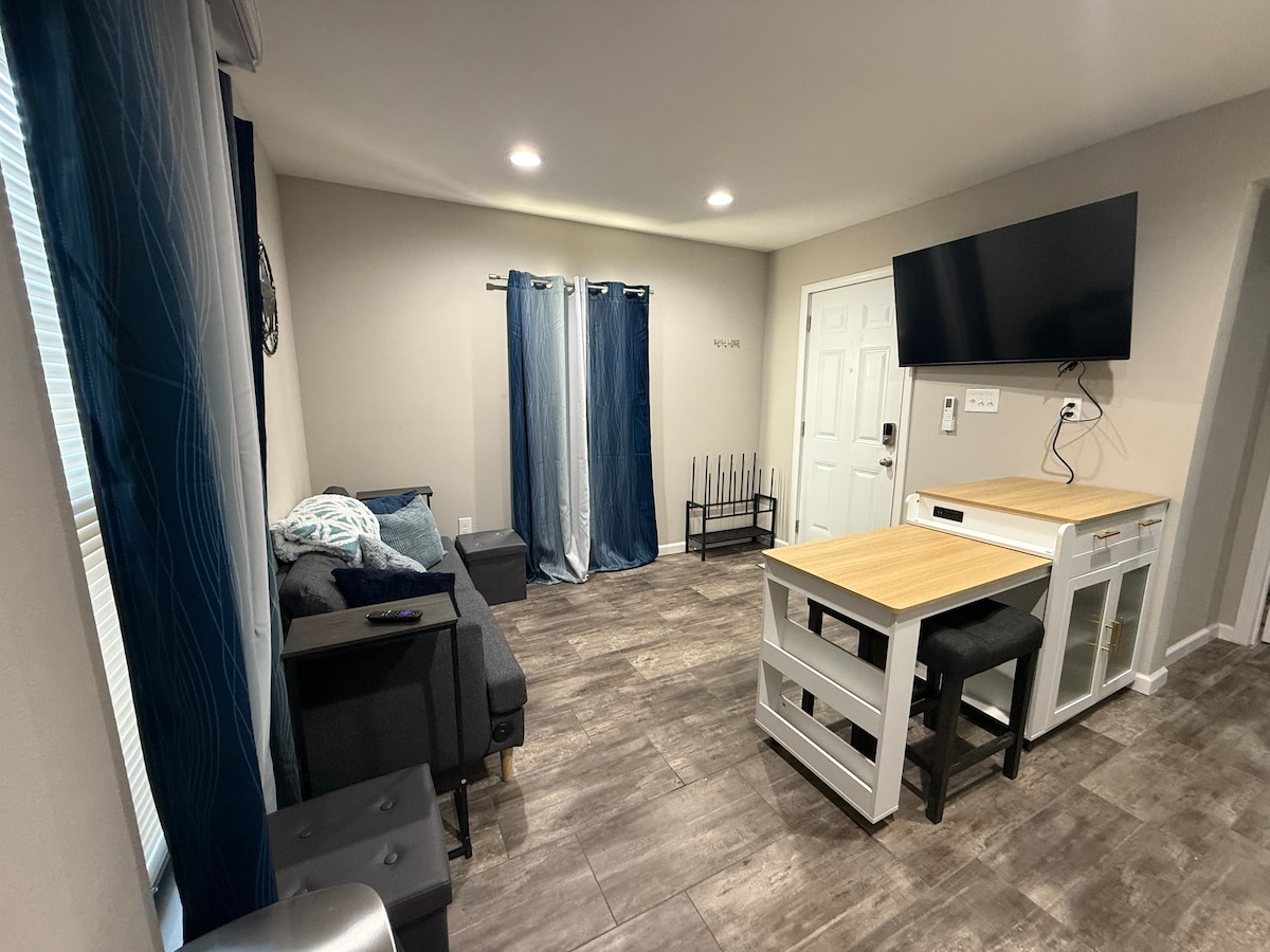 La casa de huéspedes de eficiencia con cocina ofrece comodidad a los huéspedes mientras se mantienen alejados de casa. Esta propiedad vallada está a las afueras de la ciudad con su propio lugar de estacionamiento de hormigón. La habitación principal tiene una cama queen y un televisor. La cocina está equipada con utensilios y utensilios de cocina y el baño tiene una ducha de tamaño completo. **El propietario comparte el mismo patio.