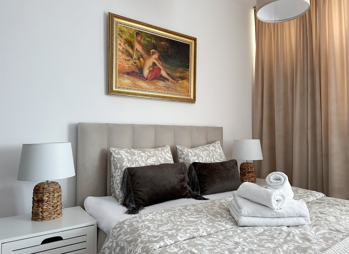 Apartamento cómodo y totalmente equipado en un edificio nuevo. Sala de estar con cocina abierta dividida en comedor y sala de estar. El dormitorio tiene una cama grande y un armario espacioso. También hay un armario como espacio de almacenamiento adicional. En la zona hay tiendas, restaurantes y cafeterías. Equipamiento: aire acondicionado, cafetera, hervidor de agua, plancha, tabla de planchar, lavadora Cómo llegar desde el aeropuerto de Chopin 20 minutos en taxi 50 minutos en transporte público desde el aeropuerto de Modlin 50 minutos en taxi 120 minutos en transporte público