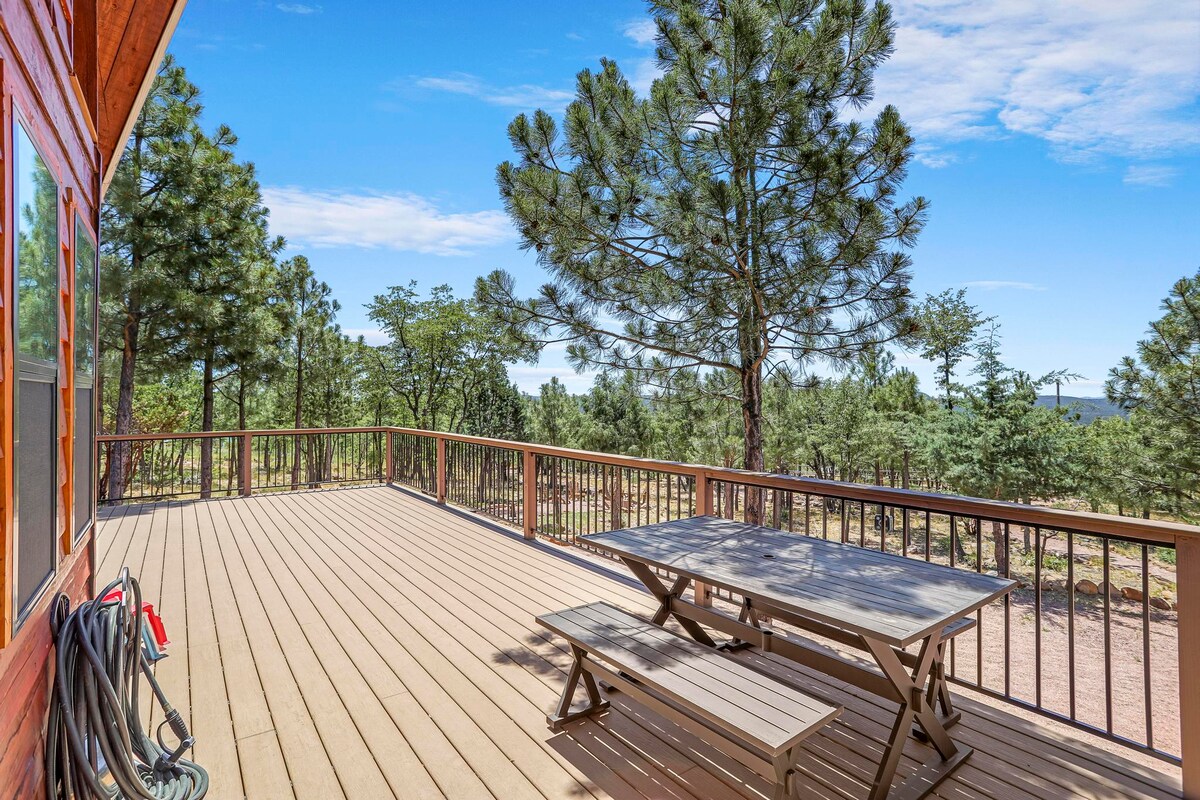 Rim View: donde la única razón para irse es para poder volver. Disfruta de impresionantes vistas desde cada ventana y la terraza envolvente mientras disfrutas de las comodidades del hogar. 3 dormitorios, 2 baños y mucho espacio al aire libre hacen que Rim View sea perfecto para un máximo de 6 personas. Prepara la cena en la cocina gourmet o haz una parrilla en el patio mientras contemplas la puesta de sol sobre el Rim. Puedes conducir montaña abajo, girar a la izquierda y ver todo lo que Pine tiene para ofrecer. Pine es fácil de conducir y está a menos de 2 horas del valle.