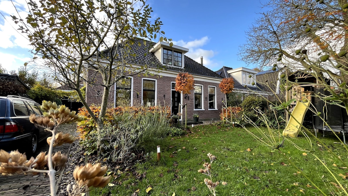 Spacious house (250m2) for 8 adults and 4 children. 270*view. Big garden. Fantastic location: 5 min walk to the old city and public transport, between Amsterdam Center (20 min) and various historic picturesque cities (10-20 min). Private parking & wheelchair ok. It used to be an old cow-farm ( 100 y/o) which we converted into 2 big houses. You are welcome in the front house. Minimum stay 3 nights. Pls note: pay tax 3 euro per night p.p. @ arrival in cash! PS: no parties!