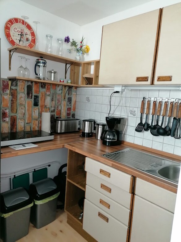 Sie wohnen gemütlich und authentisch auf 24qm in unserem "Bauernstüble". Im Wohnraum befindet sich eine Essecke, ein Kleiderschrank, Sofa und Satelliten-TV. Über eine Treppenleiter gelangen Sie in den Schlafbereich mit einer 140x200cm Matratze. Angrenzend zum Eingangsbereich befindet sich eine kleine aber vollwertig ausgestattete Küche. Ein modernes Badezimmer mit Fußbodenheizung und Tageslicht rundet die Wohnung ab. Eine Waschmaschine + Trockner kann für 4€ pro Waschladung mitbenutzt werden.