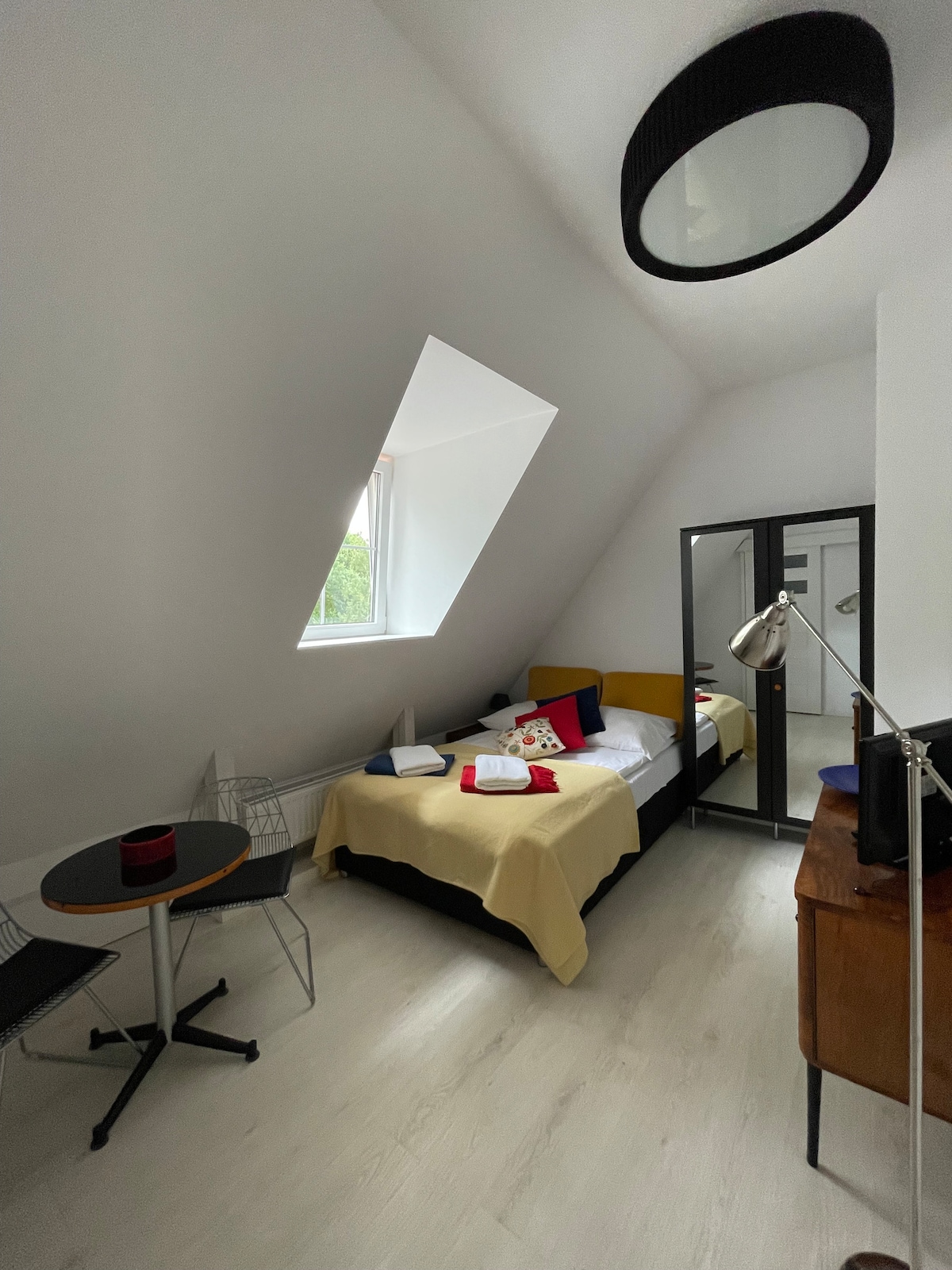 Apartment 34 is a very unique 3 level flat. It is entirely located in the historical water tower. Round walls of red brick, beautiful spiral stairs combined with modern equipment create a unique character of this apartment. An independent entrance ensures the privacy and comfort of our guests. Appartment has fully equipped kitchen, 2 bathrooms (bathtub & shower) and 2 bedrooms on the first floor (for 2 people each), 3rd bedroom in the basement (4 single beds) + sofa bed (living room)