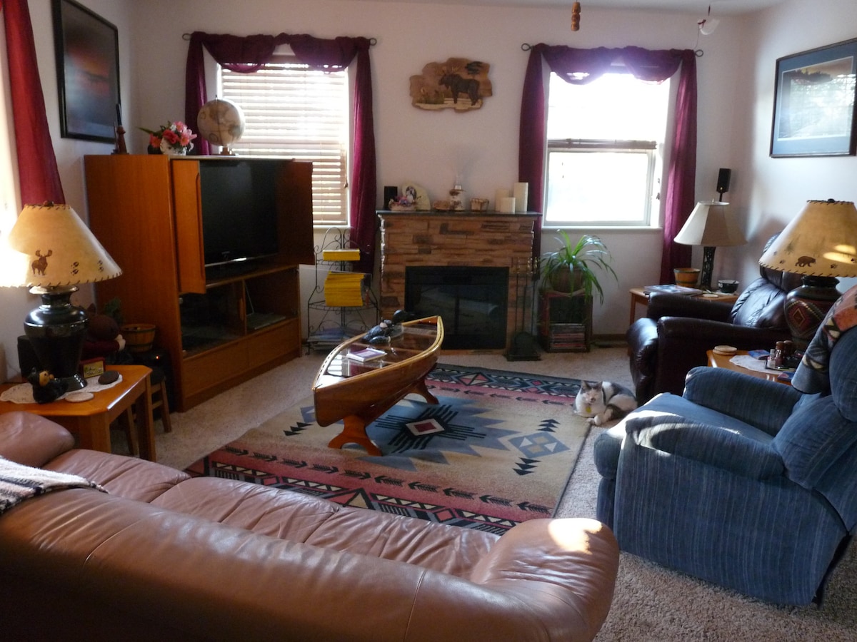 Suite de invitados independiente en la planta baja de Log Home. Finca privada rodeada por un antiguo bosque de pinos Ponderosa. Dos amplios dormitorios, un baño grande, sala de estar y cocina completa de nogal personalizada con electrodomésticos de acero inoxidable nuevos y un lavadero. Muy tranquilo, seguro y silencioso. La carretera es un camino de tierra estilo Montana. Cuando NO hay nieve, cualquier coche puede subir la colina. En invierno necesitarás un vehículo de cuatro ruedas. Quitamos la nieve de la carretera según sea necesario en invierno. Se admiten mascotas.