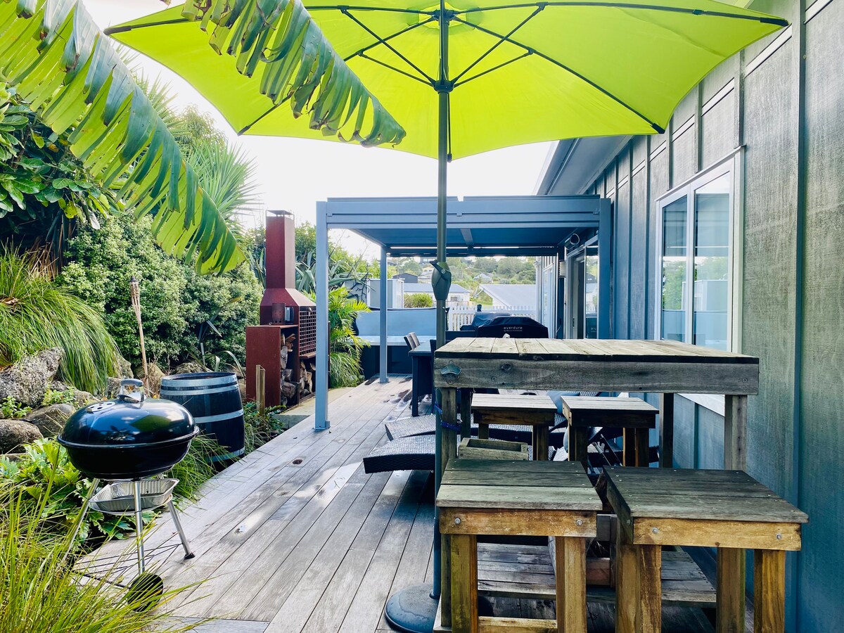 ¡Tu refugio tropical te espera! 🌴 The Banana Hut es un refugio luminoso, privado y romántico en la impresionante bahía de Taurikura con vistas mágicas al monte Manaia. Sumérgete en tu propia piscina de spa, enjuágate bajo la cálida ducha al aire libre o relájate en la sauna. Las bicicletas y los kayaks están listos para explorar, y la playa está a solo 5 minutos a pie. Surfea, camina, pesca o simplemente relájate y deja que la naturaleza te restaure en este tranquilo paraíso costero rodeado de palmeras, canto de aves, sol o bajo las estrellas.