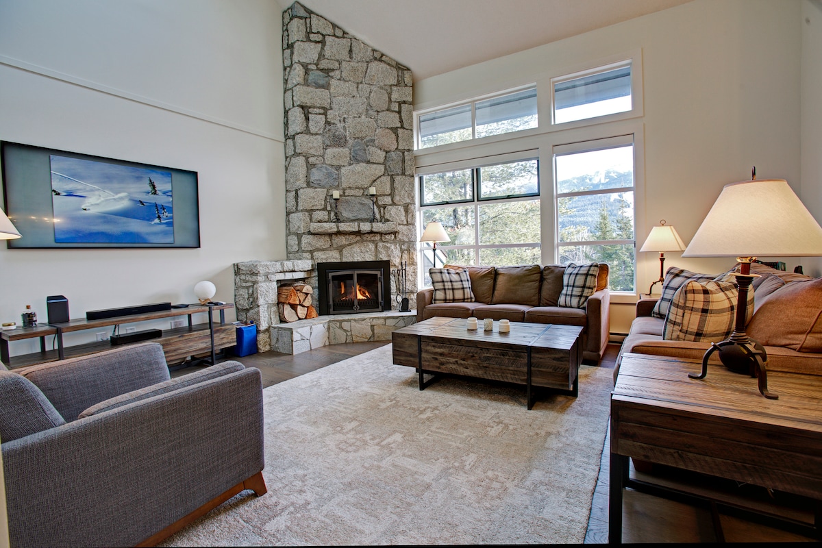Al norte del pueblo, en un hermoso chalet orientado a la familia: ¡4 dormitorios cada uno con baño privado, l y chimeneas nuevas! La sala de estar, el comedor y la cocina son un gran espacio abovedado en la planta superior con aire acondicionado: madera dura, chimenea grande nueva, mesa de comedor larga, además de una terraza enorme que incluye sofás al aire libre, 2 sombrillas, barbacoa y comedor. Cuarto de barro independiente con calefacción y una nueva lavadora/secadora doble. Disfruta de las vistas de los esquiadores y ciclistas de Blackcomb y Whistler desde un jacuzzi privado que da a una reserva natural.