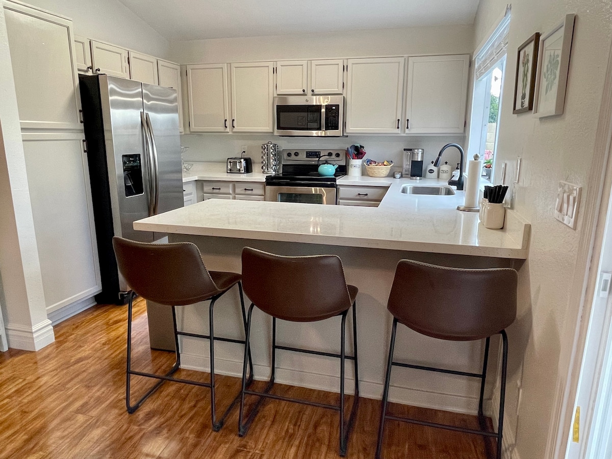 Encantadora casa de vacaciones situada en el centro de Wickenburg. Es una gran relación calidad-precio para huéspedes diarios, semanales y mensuales. Cocina totalmente equipada e incluye sábanas, toallas y también tenemos una estación de café totalmente equipada. Tenemos 3 camas tamaño queen, colchón de aire tamaño queen y sofá para dormir. Se encuentra en la cima de una colina con excelentes vistas a la montaña. ¡Relájate en el gran patio para charlar con familiares y amigos, cenar o jugar al Cornhole! Tenemos una CÁMARA instalada junto a nuestro garaje.