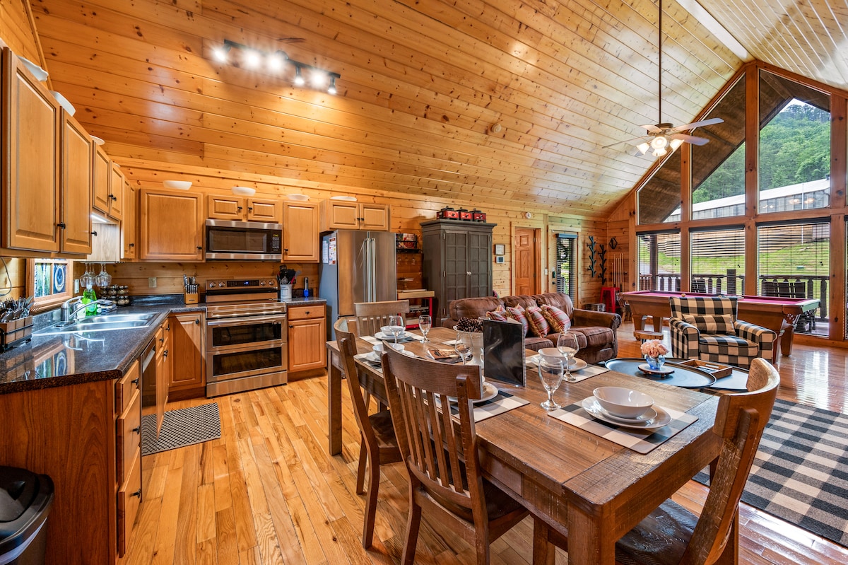 Al entrar en la cabaña, la impresionante belleza de los troncos escandinavos importados llena tus sentidos y te da la bienvenida a tu nuevo hogar lejos de casa. Disfruta de las muchas comodidades y comodidades en esta cabaña de diseño profesional que se encuentra en un tranquilo entorno boscoso semi aislado. Haz un corto viaje de 2,5 millas a la avenida principal en Pigeon Forge, que te aleja a minutos de Dollywood, The Island y muchas otras atracciones.