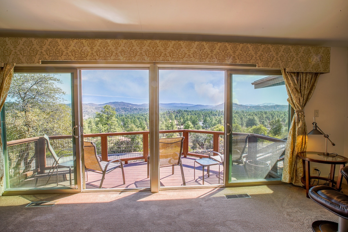 This cozy cabin with million dollar views is a great place for families and couples to unplug and relax while sitting on the deck enjoying the panoramic view of the national forest, stars and city lights. You'll probably see a deer below the deck. We get lots of birds and squirrels at our feeder. Full kitchen, deck grill, comfortable sectional sofa, queen air mattress, 2 twin mattresses. We're approx 15 min from downtown Whiskey Row, Starbucks and Walmart. AC units in bedrooms and family room.