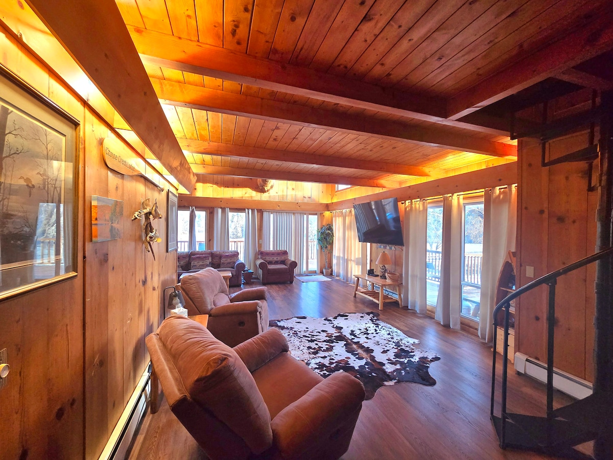Desconecta de la rutina en este alojamiento único y relajante. Esta casa de troncos, ubicada en 6,5 acres, ofrece unos días lejos del ajetreo de la vida cotidiana. El loft es donde se encuentran el dormitorio principal y el baño. El segundo dormitorio/baño se encuentra en la primera planta. El sótano sin terminar ofrece una zona para hacer ejercicio en la máquina elíptica y el banco de pesas. Relájate durante las horas de la noche en el patio trasero, reunido alrededor de la hoguera. Los televisores se encuentran en la sala de estar, el sótano y la cocina.