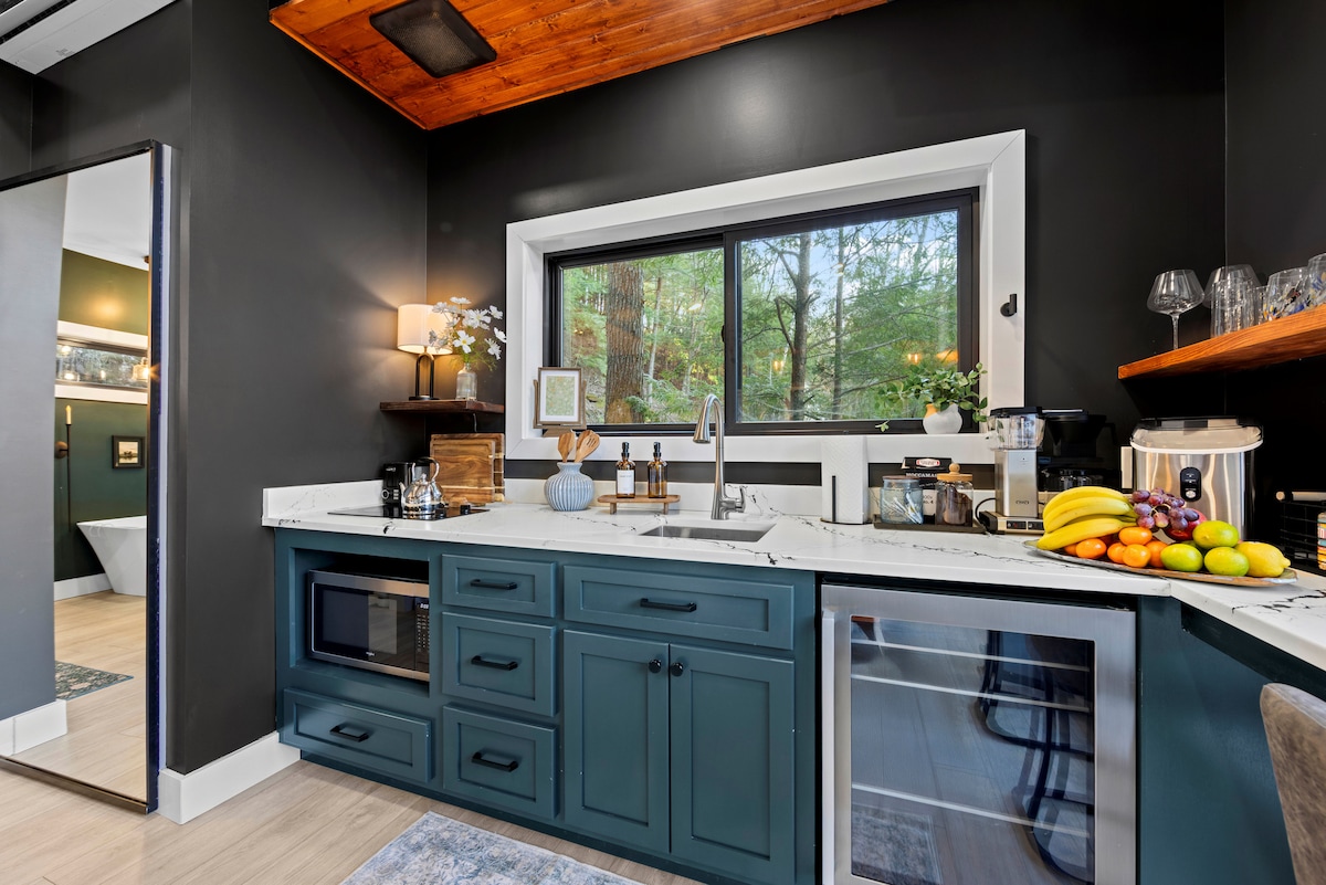 Cabaña de lujo con chimenea, kayaks y muelle.