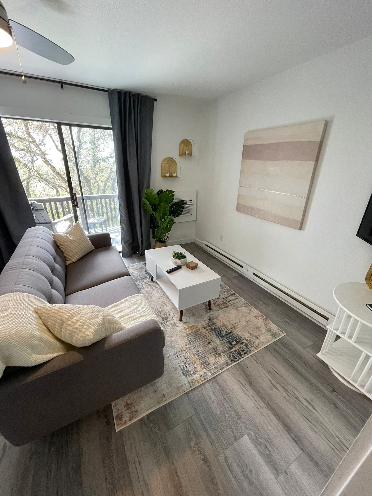 Ven a relajarte en nuestro elegante y único Tree Loft. Convertimos un estudio de fotografía de más de 800 pies cuadrados en un apartamento de moda. El techo de la sala de estar alcanza los 20 pies. Suspendido sobre la sala de estar se encuentra el dormitorio con vistas a las copas de los árboles. El baño está justo debajo del dormitorio, al final de las escaleras. Las generosas ventanas acercan el exterior. Salga al porche de malla para tomar el café por la mañana o al pequeño patio trasero privado totalmente vallado.