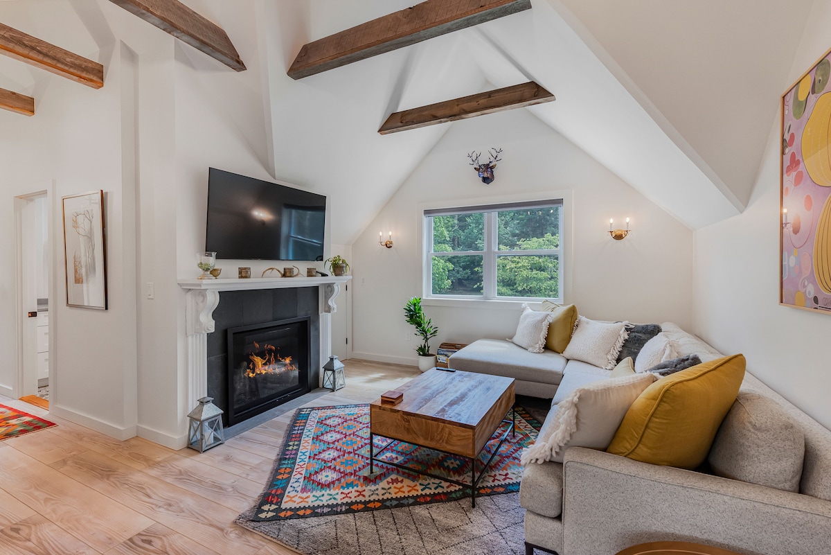 Apartamento privado moderno/rústico A PIE DE LA CIUDAD Calificación 5 * "PREMIER" ¡SIN CARGOS ADICIONALES! 1000 pies cuadrados Se admiten mascotas n/c Parque. Suite Master King ypuedo poner 2 cots /cuna Cocina completa. Sala de estar en la catedral con vistas a la montaña. 1 1/2 baño Terraza para comer al aire libre con vista a la montaña. CHIMENEA DE LEÑA en la terraza. Wifi Lavadora/Secadora Parrilla de gas. Pasos a CTR de Town Green y parada de autobús de NYC, THE COLONY, Yum Yum, Goodnight, Garden Cafe, Silvias, Bread Alone, Mud Club, Station Bar, tiendas. Cementerio Bubbling Stream, Zona de juegos privada