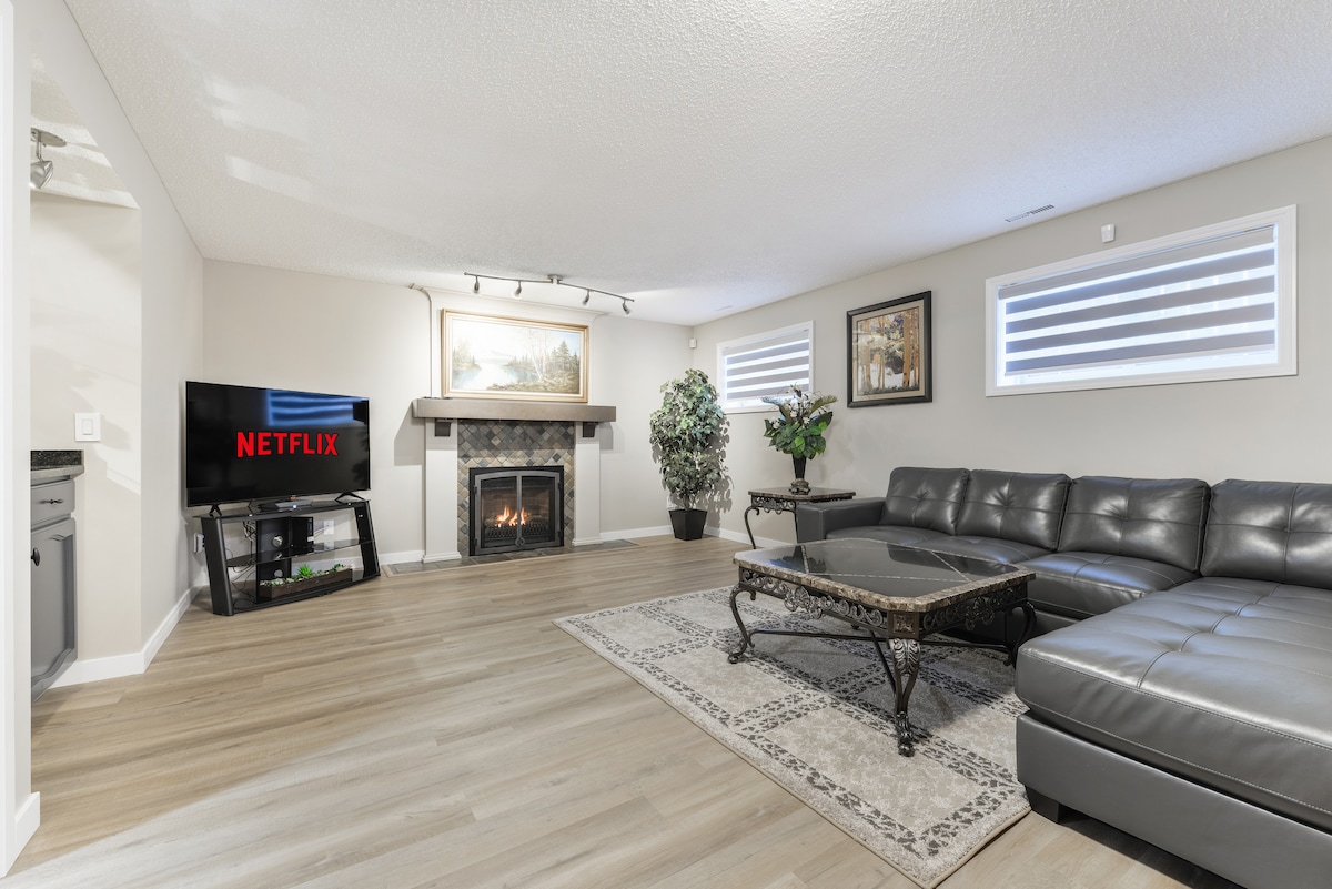 🏡 Características principales Suite en sótano legal,✔️ luminosa e impecable ✔️ 2 dormitorios con camas tamaño queen y ropa de cama estilo hotel ✔️ Futón de estilo japonés solo para el quinto huésped: uso adicional bajo petición ✔️ Cocina con cafetera Keurig con leche. ✔️ Acogedora sala de estar con TV ✔️inteligente de 58 pulgadas y elegante silla colgante interior Entrada ✔️ independiente y llegada autónoma sencilla Estacionamiento ✔️ gratuito en la calle o en la entrada 📍 Cerca A ✔️ 2 minutos en auto del centro comercial ✔️ A 15 minutos en auto del centro vacacional de esquí Rabbit Hill A ✔️ 20 minutos en auto del aeropuerto YEG A ✔️ 20 minutos en auto de WEM