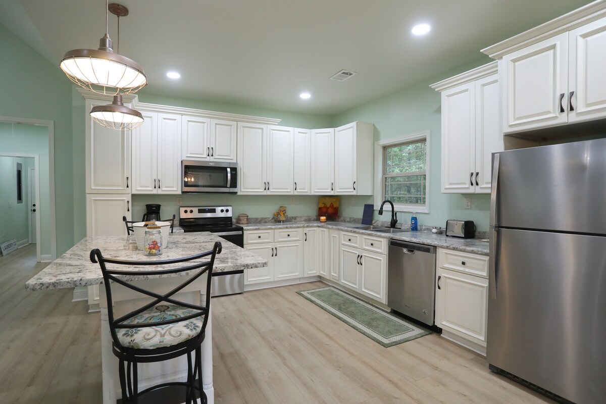 Genesis House y Revelation House también están disponibles en la misma propiedad. Hope House está enclavada entre pinos en un entorno tranquilo y aislado. El lugar perfecto para lunas de miel, aniversarios, celebraciones, reconexión de parejas y familias pequeñas. Tenemos todo lo necesario para que te sientas como en casa. Hay un estanque de 3 1/2 acres, un sendero para caminar y mucho más. Los terrenos son hermosos, con árboles, arbustos y flores. ¡Hay disponibles rutas de pesca, paseos en bote de remos, ciclismo y senderismo!