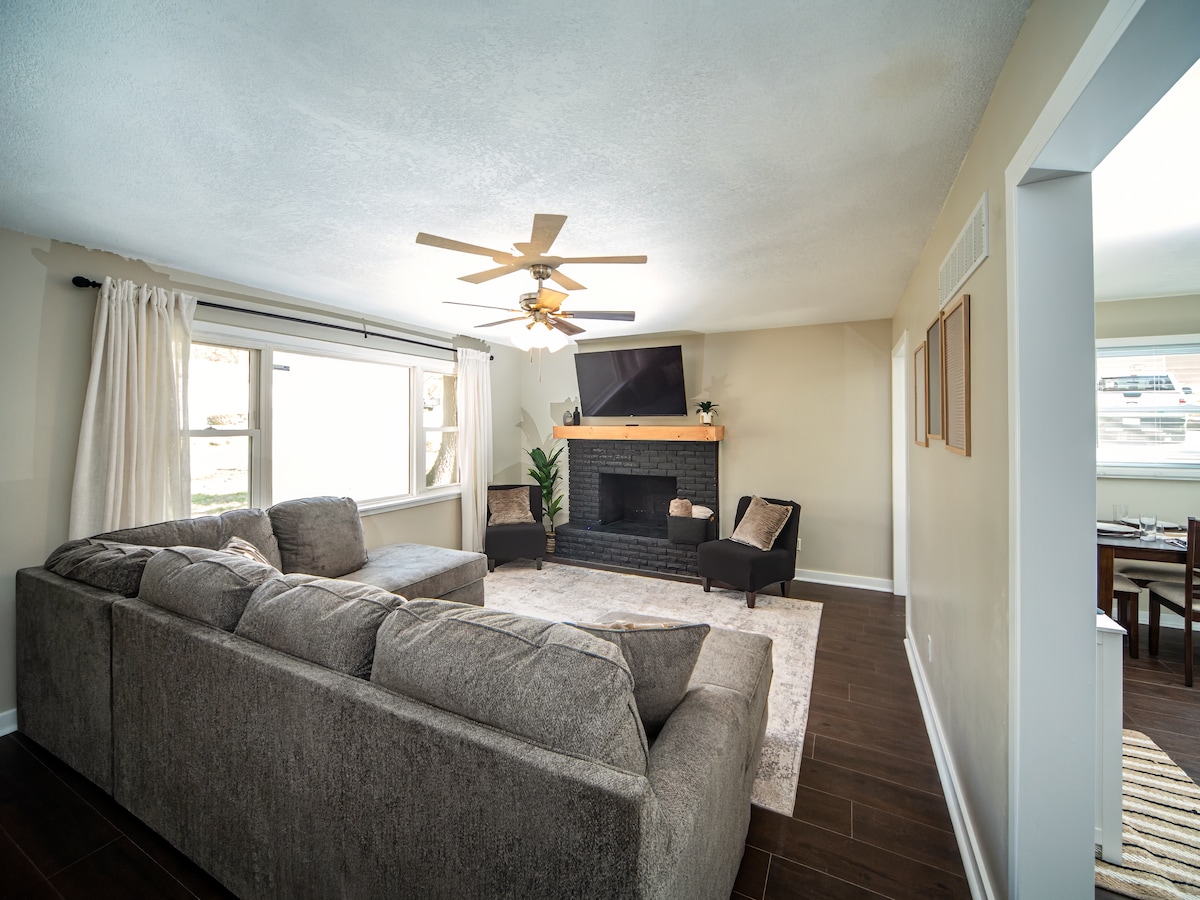 A solo 17 millas del estadio Arrowhead, esta encantadora granja moderna ofrece más de 1.800 pies cuadrados de espacio con toda la casa para ti. Disfruta de una entrada privada con amplio estacionamiento, una espaciosa sala familiar con un televisor de 75 pulgadas y una cocina abierta y un comedor perfectos para reunirse. Relájate con el café de la mañana en el porche delantero o en el patio trasero, y relájate sabiendo que cada dormitorio tiene un televisor inteligente, además de un escritorio y un sofá cama tamaño queen en el nivel principal.