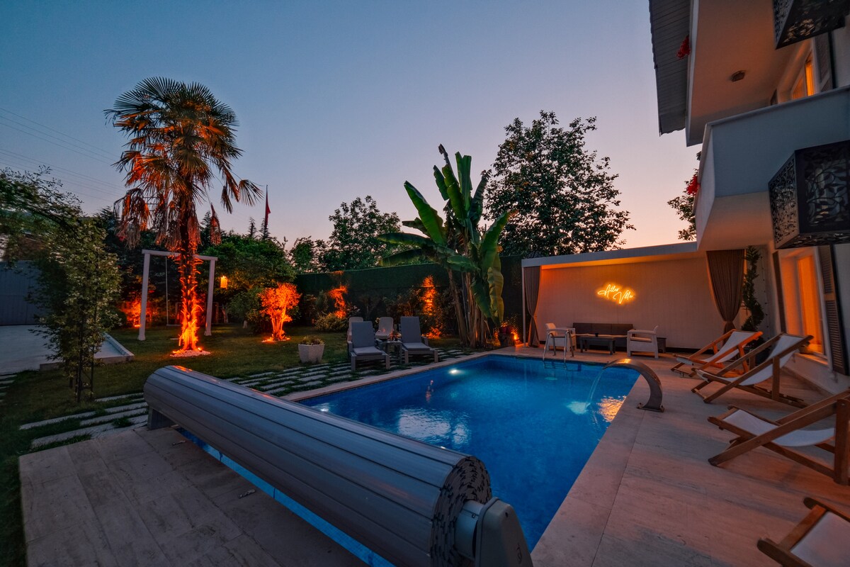 Es un gran placer para nosotros recibirte en nuestra villa familiar única, donde puedes disfrutar de la magnífica vista al lago y la naturaleza con el canto de los pájaros y no te perderás las comodidades y el confort de tu hogar. Características destacadas 4 habitaciones, 3 baños + sillones que pueden ser camas Vista única al lago Sapanca Jardín independiente, chimenea, jardín de invierno, patio Comodidad en el hogar Cocina y baño totalmente equipados Piscina infinita, área de parrilla Wifi, aire acondicionado, TV, estacionamiento privado Alojamiento cómodo para un máximo de 8 personas