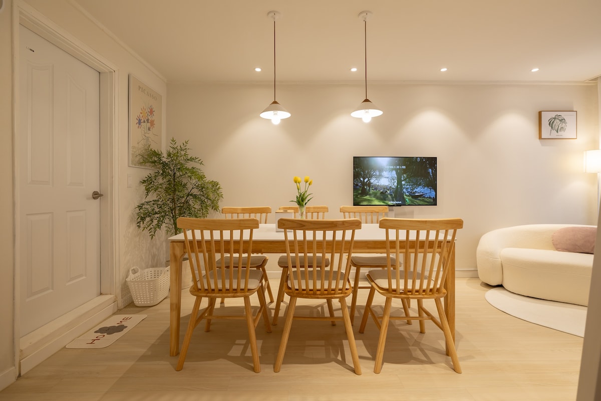 Hola, Recientemente, este alojamiento completó todo el interior. Es una casa adosada acogedora y hermosa. (¡Interior completado en octubre de 2024!) Se tarda unos 7-8 minutos a pie desde la salida 1 de la estación universitaria de Hongik. La parada de autobús del aeropuerto también está cerca. La sala de estar está bien iluminada, También hay una terraza exterior donde puedes relajarte. Hay una mesa para 8 personas y un sofá de tela de ganso. Las camas están equipadas con ropa de cama de estilo hotelero y colchones de alta calidad. Dormitorio1- Cama tamaño queen + queen Habitación 2- Queen + Queen < Características del anuncio > * ¡Estacionamiento gratuito disponible! * Se proporciona una caja de almacenamiento de equipaje gratuita. * Artículos en la casa - Lavadora y secadora - Refrigerador. - 2 secadores de pelo. - Plancha de vapor. - Cocina de infrarrojos - Microondas y nevera. - Aire acondicionado en cada habitación. - calefacción por suelo radiante - Televisor inteligente de 65 pulgadas. - Se puede proporcionar silla para bebés, bañera para bebés y cubiertos para bebés a pedido. - ¡Totalmente equipado con varios electrodomésticos, platos y utensilios de cocina! - No se admiten perros.