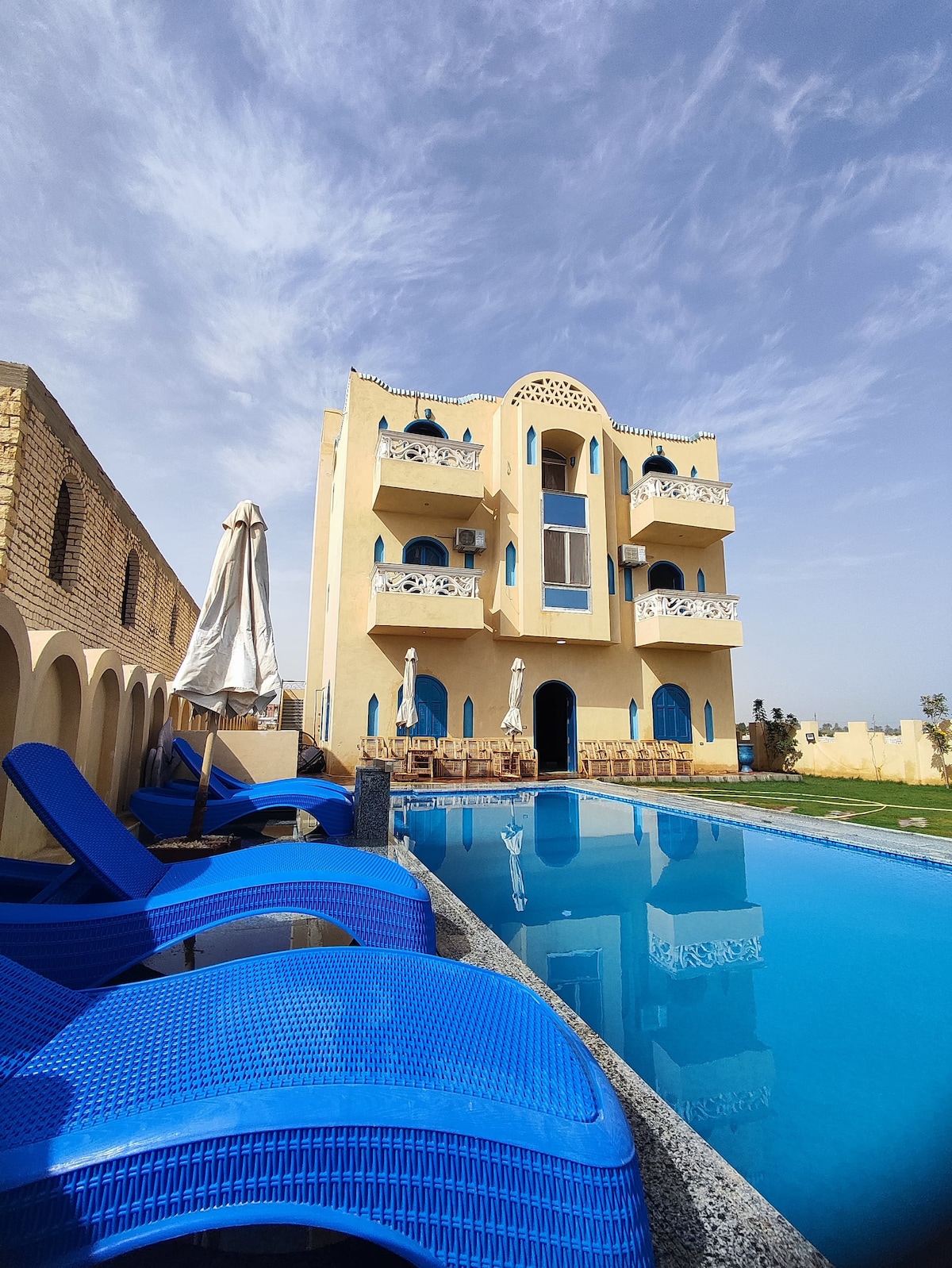 A private accommodation in Tunis Village overlooking the scenic Qarun lake. The living space includes a fully equipped studio with a beautiful garden & an outdoor swimming pool.