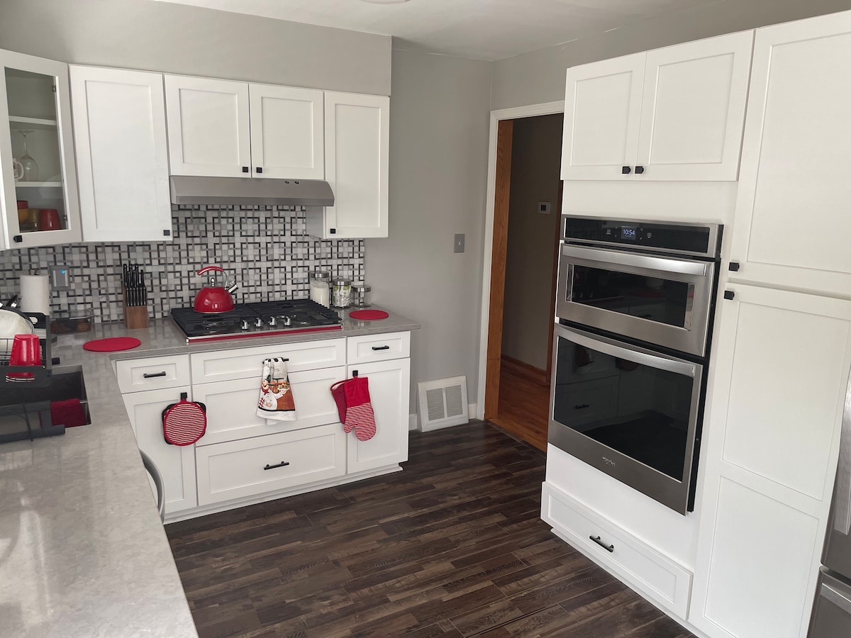 Disfruta de la comodidad del hogar en esta casa recién remodelada. ¡Bienvenido, relájate y disfruta! Esta casa es todo comodidad. Desde el sofá modular y la televisión de pantalla grande en la sala de estar hasta la cocina totalmente equipada con horno doble y lavavajillas, mesa de comedor extensible (con capacidad para ocho personas), camas cómodas y lavandería en el sótano, esta casa ofrece a nuestros huéspedes la comodidad del hogar. Un patio trasero vallado ofrece un gran espacio para los niños.