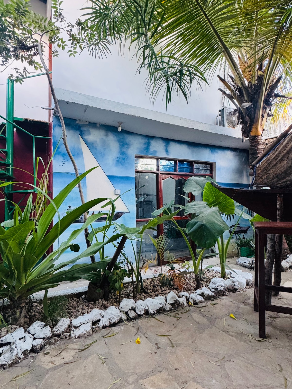 Escape to our tranquil guesthouse nestled in Zanzibar's bush. Two spacious and bright rooms offer private bathrooms, balcony/ patio and entrance. The rooms boast a large-sized bed for ultimate comfort. Share our outdoor kitchen, garden and covered sitting area. Our gym is located nearby (5 walking minutes); yoga, dance, boxing and fitness classes are available. The beautiful beach with restaurants is a 10-minute walk away. Experience serenity and convenience in paradise.
