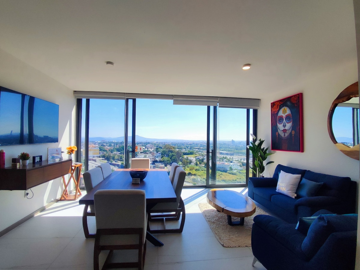 ¡¡Bienvenido a tu Hospedaje!! El lugar perfecto para disfrutar tu vida. La mejor vista de la ciudad de Guadalajara. Este lugar cuenta con todo lo que necesitas para pasar una estancia inolvidable. Ven y relájate en nuestra alberca semi-olímpica, saca el estrés en el gimnasio súper equipado, o solo relájate con una copa de vino desde la increíble vista del piso 16. El espacio incluye: 2 recámaras 2 baños completos Cocina equipada WiFi de alta velocidad Estacionamiento incluido