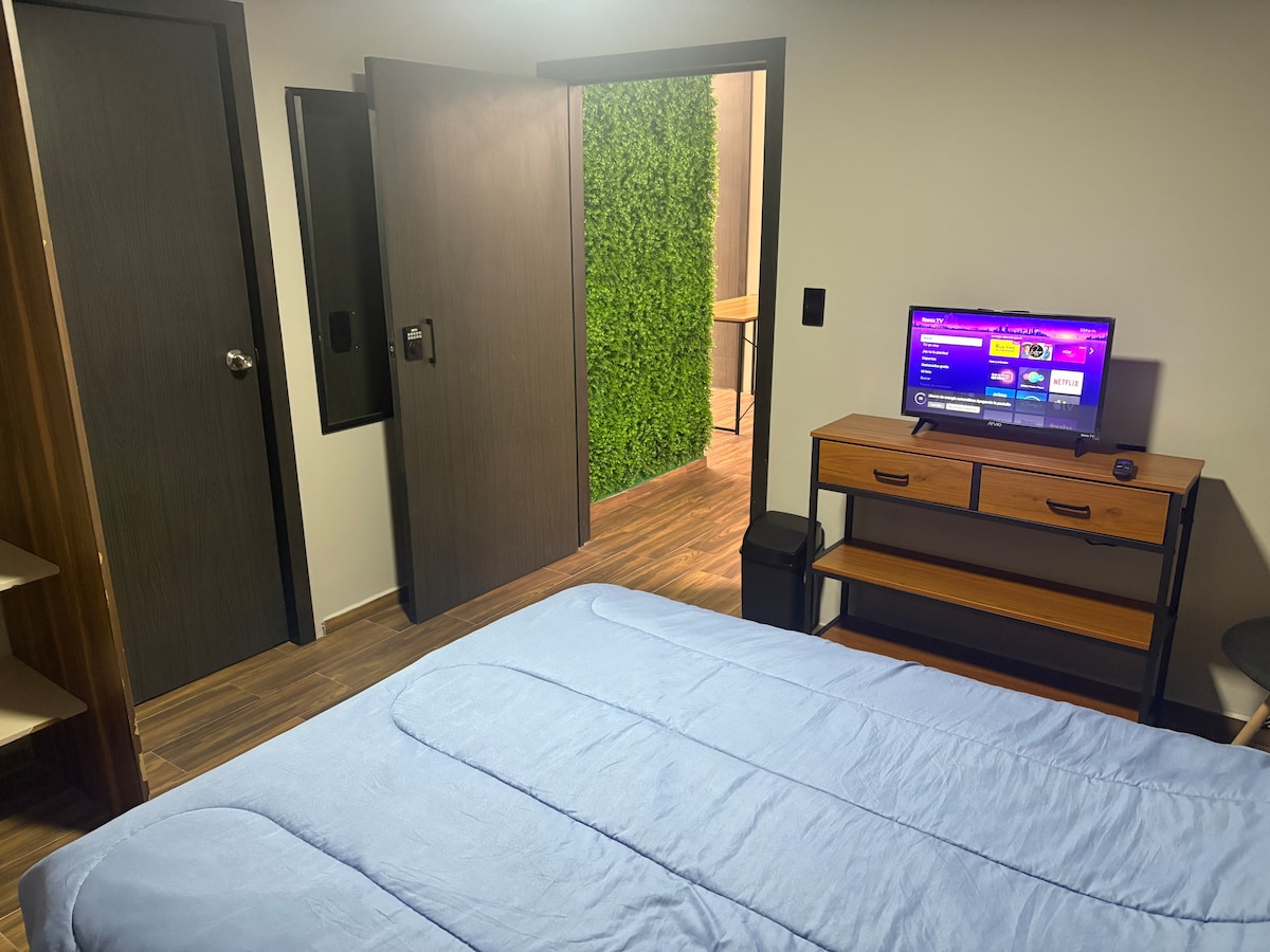 Agradable Estudio con 1 cama matrimonial, baño privado, y terraza compartida, equipado con frigobar, horno microondas, cafetera, y escritorio. En una zona residencial, tranquila, con excelente ubicación. Cerca de lugares como: Centro Comercial Midtown, Plaza Sao Paulo, Hospital Country 2000, Hospital México Americano, Estación de Tren Ligero Linea 3, Casino, Farmacias, Templos, del Centro Histórico, Bares, y Restaurantes.