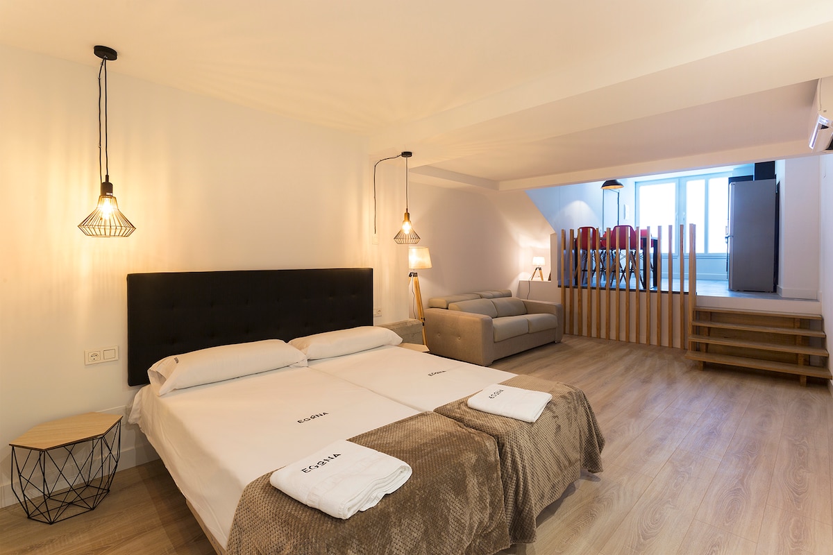 Es un espacio en el ático como loft, de uso privativo para los huéspedes. Dispone de plaza de garaje en el sótano. Alto, decorado con mucho gusto y muy luminoso. Perfecto para una pareja que busque un espacio limpio, tranquilo y céntrico. Ubicado en lo alto de un edificio residencial contiguo a la zona de pinchos y a 5 min de la playa. Totalmente equipado. Toallas y ropa de cama de algodón. Área útil de 26 m2 más el área amansardada. Estrictamente no fumadores