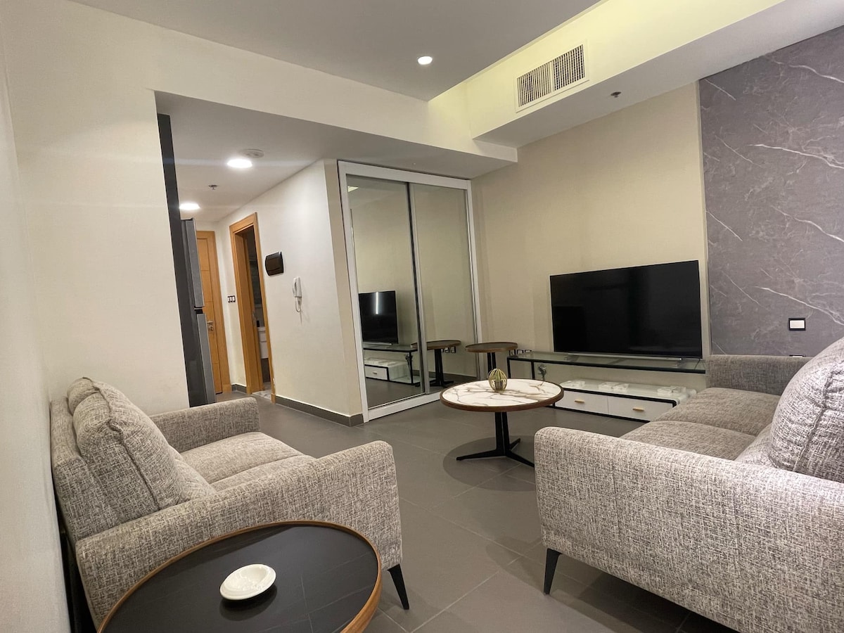 Your family will be close to everything when you stay at this centrally-located place. The Appartmemt is 77 m2 with a bedroom, living area separate kitchen and a Sofa bed. And Private toilet. The building has 24 hours security, underground parking, gym, and an indoor and outdoor swimming pool. The apartment is equipped with all requirements, refrigerator, stove, washing/drying machine, 50inch tv, wifi, cooking requirements, and many more