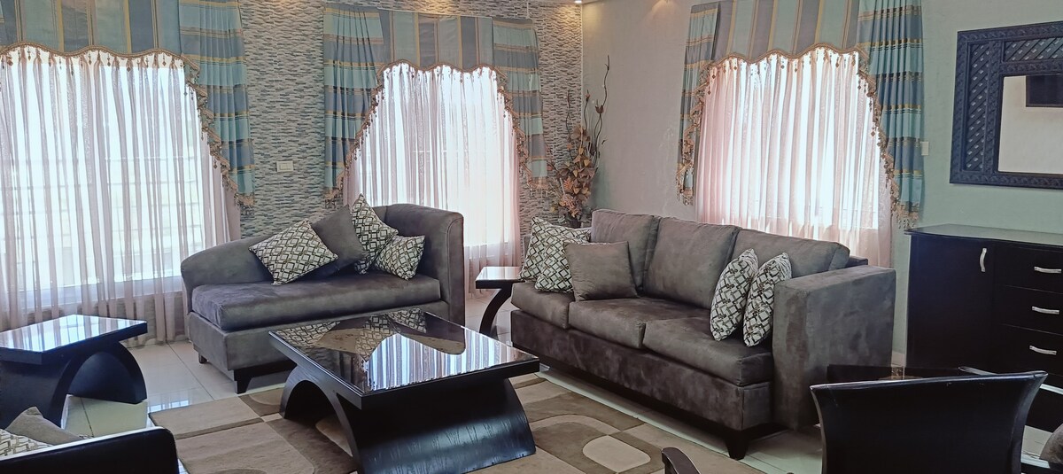 Lujo moderno en el corazón de Amán. Este espacioso apartamento de 3 dormitorios y 2,5 baños tiene capacidad para 8 personas con elegantes suelos de mármol, iluminación LED y una elegante sala de estar abierta. Los aspectos más destacados incluyen una cocina alemana personalizada con electrodomésticos de primera calidad, lavadora y secadora en la unidad y un balcón privado con asientos para cinco personas y un columpio. Con aire acondicionado en todas las habitaciones y WiFi de alta velocidad, es el alojamiento perfecto para familias, viajeros de negocios o grupos que buscan comodidad y estilo.