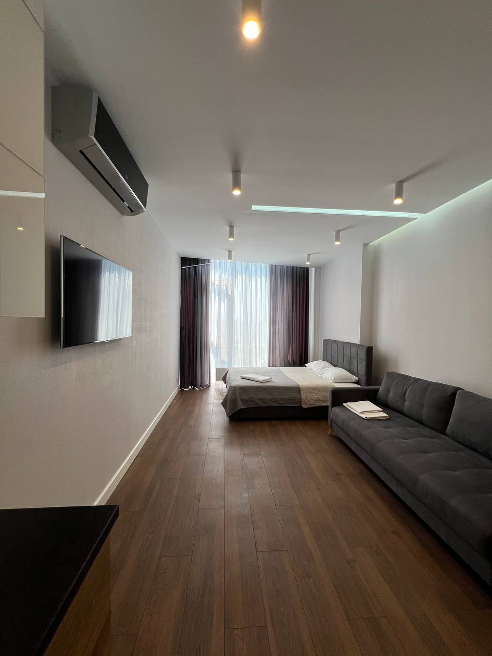 Nuestro alojamiento está diseñado para un descanso cómodo. Se encuentra en una casa nueva y elegante con un interior moderno, Wi-Fi rápido, aire acondicionado y recirculación de aire, y un baño elegante, con secador de pelo y secador de toallas eléctrico. El apartamento tiene un televisor grande de 43 pulgadas, microondas, juego de té, vajilla, nevera con congelador, albornoces, kits de higiene, jabón, champú.