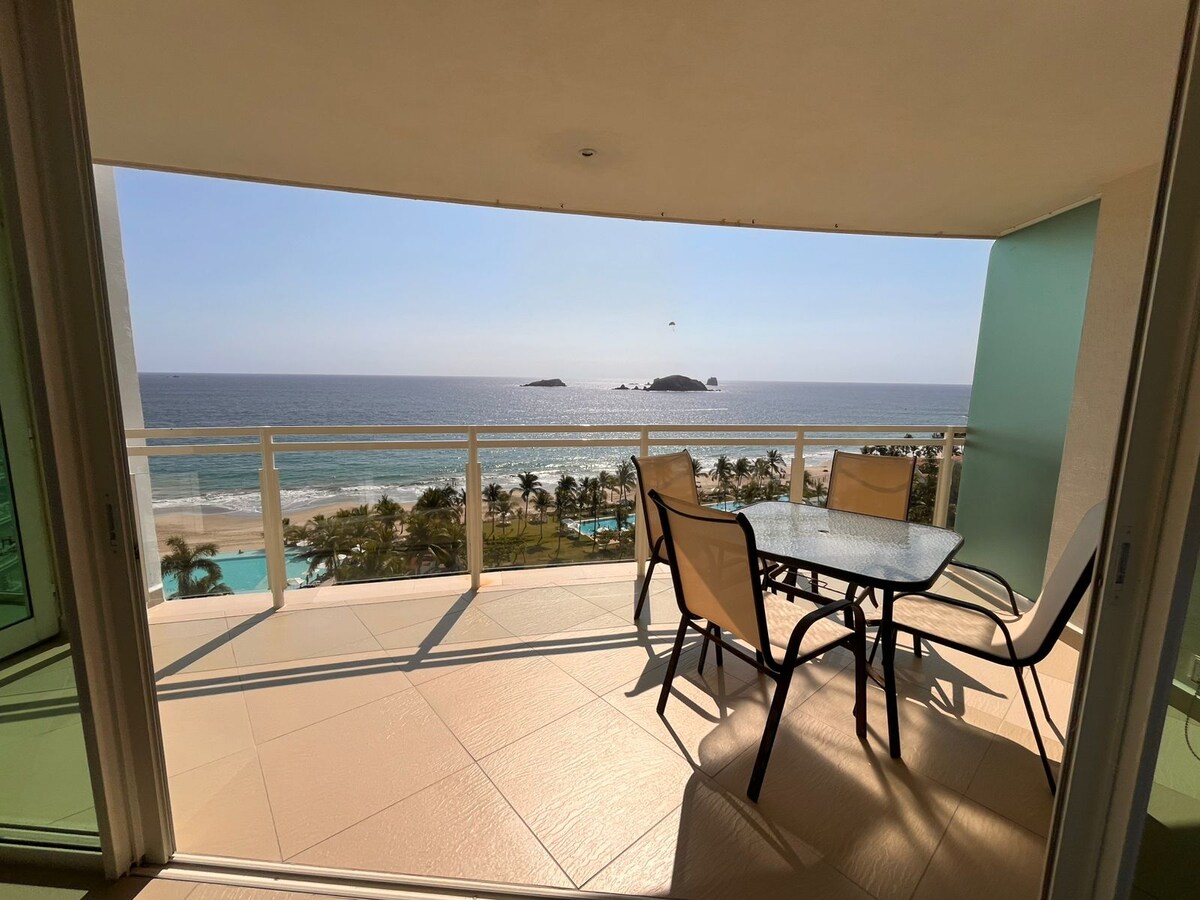 Desarrollo de lujo frente al mar, a pie de playa. Península Ixtapa se encuentra a unos pasos de la Marina y de la Zona Hotelera, así como de comercios y servicios. El departamento ubicado en el piso 15 cuenta con 2 recámaras, 2 baños completos, amplia estancia con sofá cama. Wi Fi, 2 Smart TV con Sky y Netflix, En la terraza se encuentran el comedor y la sala con vista al mar. El desarrollo cuenta con 2 albercas, asoleaderos, acceso directo a la playa, snak bar, restaurante y estacionamiento.