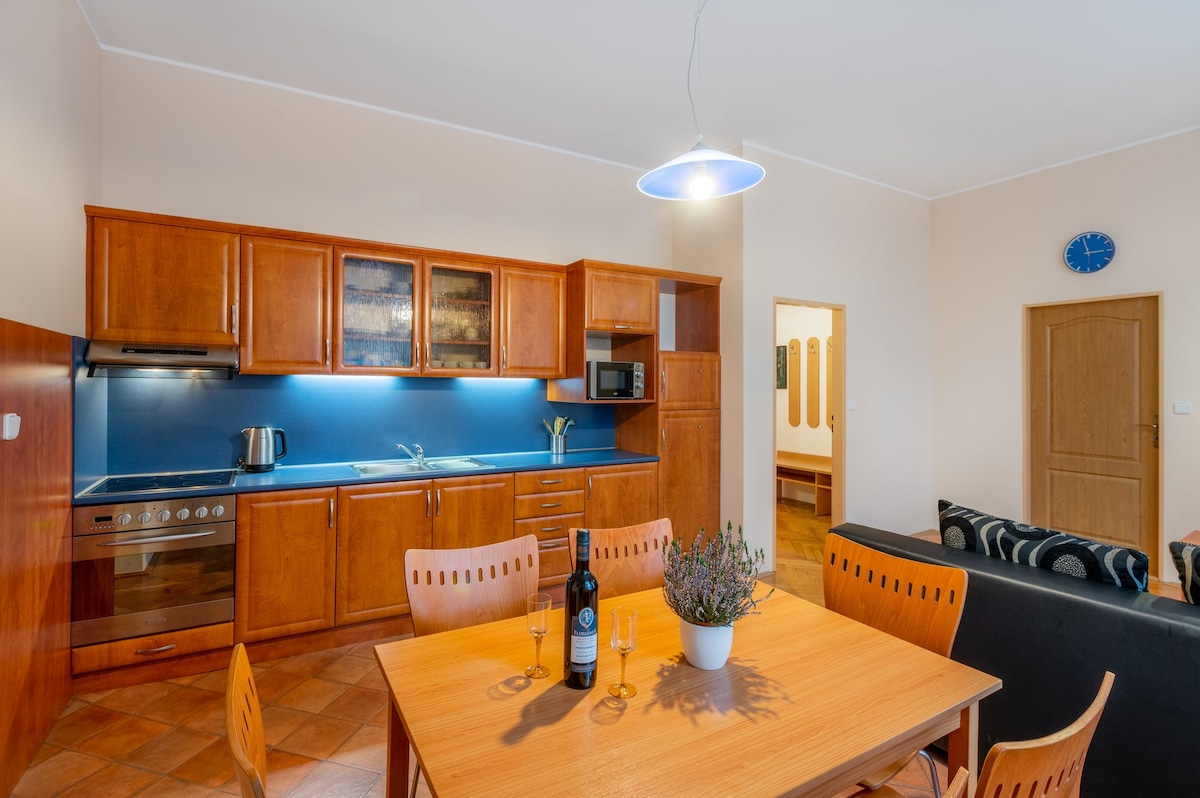 El apartamento en el último piso es realmente único. Se encuentra en el segundo piso y todo el lugar ha sido restaurado al edificio original. El marco de madera del techo original, el ladrillo visto, el suelo original y la estufa de madera totalmente funcional te ayudan a imaginar cómo vivía la gente a principios del siglo pasado. La sala de estar principal está orientada a la parte delantera de la casa y, por lo tanto, tendrás vistas a la plaza del pueblo, la casa del pueblo y la famosa roca de basalto «Jehla».