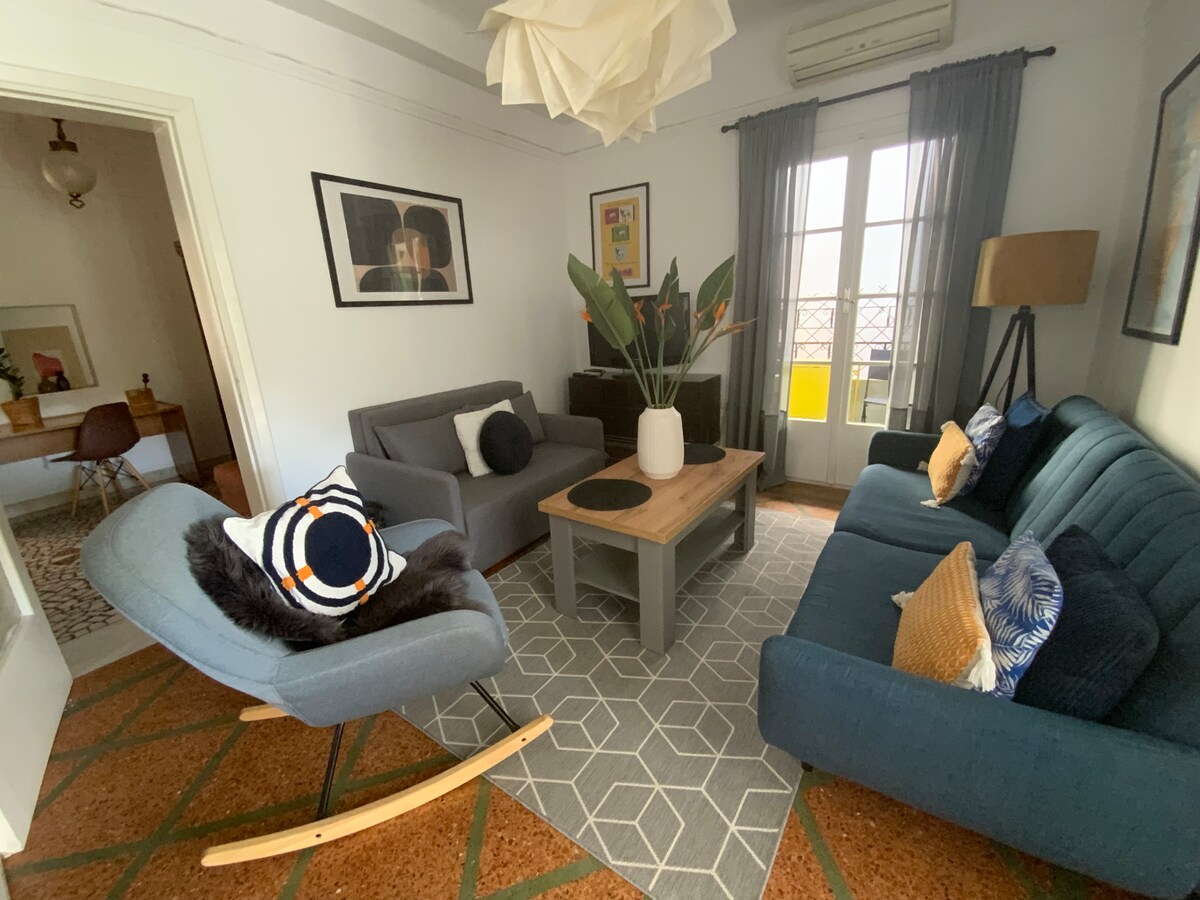 Escápate a tu oasis privado en el corazón de Atenas. Esta casa adosada única y espaciosa, Un antiguo punto de referencia del barrio de Zografou, ofrece una estancia inolvidable con su impresionante jardín en la azotea de 50 m². Perfecto para parejas, familias o trabajadores remotos que buscan un base cómoda y elegante para explorar la ciudad.